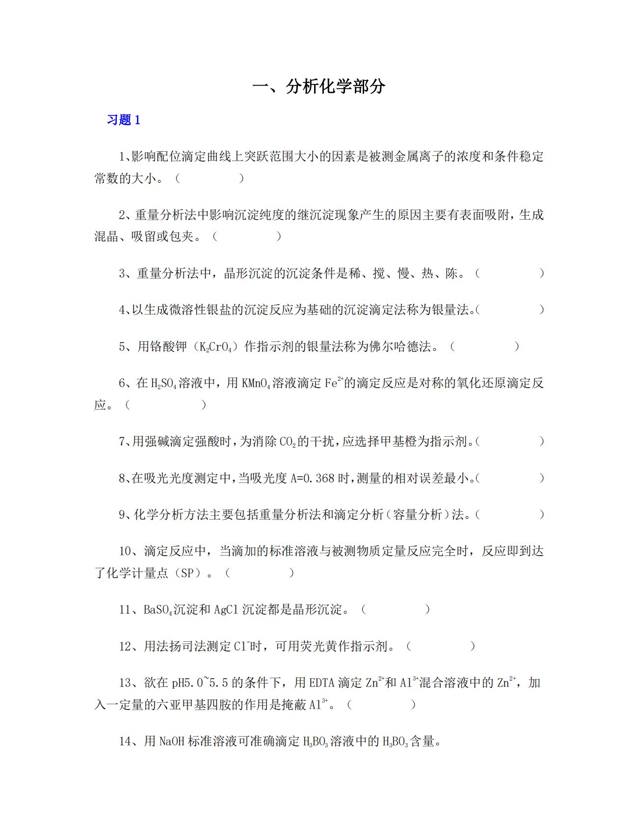 一、分析化学部分习题11、影响配位滴定曲线上突跃范围大小的因素是被测金属离子的浓度和条件稳定常数的大小。()2、重量分析法中影响沉淀纯度的继沉淀现象产生的原因主要有表面吸附,生成混晶、吸留或包夹。()3、重量分析法中,晶形沉淀的沉淀条件是稀、搅、慢、热、陈。()4、以生成微溶性银盐的沉淀反应为基础的沉淀滴定法称为银量法。()5、用铬酸钾(K2CrO4)作指示剂的银量法称为佛尔哈德法。()6、在H2SO4溶液中,用KMnO4溶液滴定Fe2+的滴定反应是对称的氧化还原滴定反应。()7、用强碱滴定强酸时,为消除CO2的干扰,应选择甲基橙为指示剂。()8、在吸光光度测定中,当吸光度A=0.368时,测...