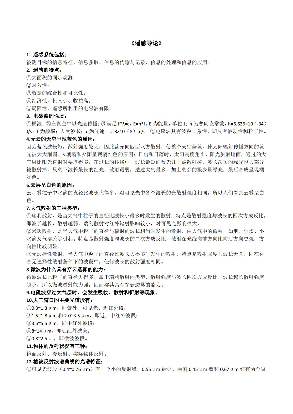 《遥感导论》1.遥感系统包括:被测目标的信息特征、信息获取、信息的传输与记录、信息的处理和信息的应用。2.遥感的特点:①大面积的同步观测;②时效性;③数据的综合性和可比性;④经济性,投入少、收益高;⑤局限性,遥感所利用的电磁波有限。3.电磁波的性质:①横波;②在真空中以光速传播;③满足f*λ=c,E=h*f。E为能量,单位J;h为普朗克常数,h=6.626×10(-34)J/s;f为频率;λ为波长;c为光速,c=3×10(8)m/s。④电磁波具有波粒二象性,即具有波动性和粒子性。4.无云的天空呈现蓝色的原因:因为蓝色波长短,散射强度较大,因此蓝光向四面八方散射,使整个天空蔚蓝,使太阳辐射传播方...