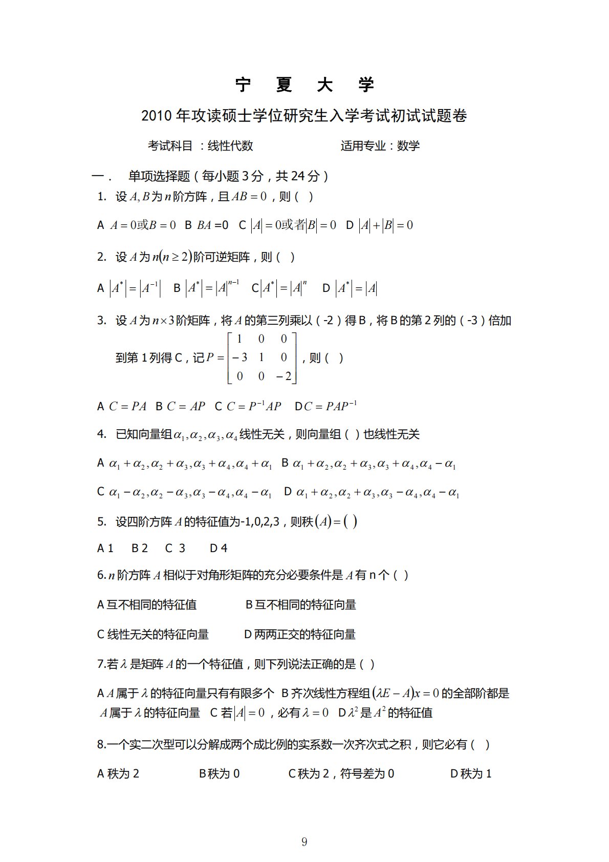 宁夏大学2010年攻读硕士学位研究生入学考试初试试题卷考试科目:线性代数适用专业:数学一.单项选择题(每小题3分,共24分)1.设BA,为n阶方阵,且0AB,则()A00BA或BBA=0C00BA或者D0BA2.设A为2nn阶可逆矩阵,则()A1*AAB1*nAACnAA*DAA*3.设A为3n阶矩阵,将A的第三列乘以(-2)得B,将B的第2列的(-3)倍加到第1列得C,记200013001P,则()APACBAPCCAPPC1D1PAPC4.已知向量组4321,,,线性无关,则向量组()也线性无关A1443322...