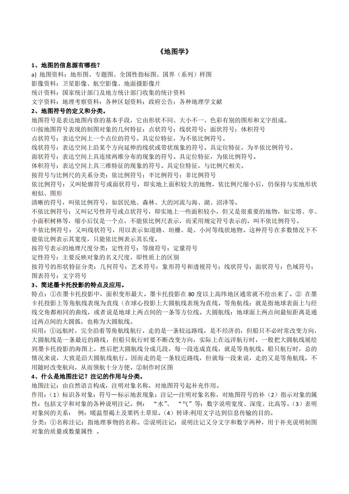 《地图学》1、地图的信息源有哪些?a)地图资料:地形图、专题图、全国性指标图、国界(系列)样图影像资料:卫星影像、航空影像、地面摄影像片统计资料:国家统计部门及地方统计部门收集的统计资料文字资料:地理考察资料;各种区划资料;政府公告;各种地理学文献2、地图符号的定义和分类。地图符号是表达地图内容的基本手段,它由形状不同、大小不一、色彩有别的图形和文字组成。⑴按地图符号表现的制图对象的几何特征:点状符号;线状符号;面状符号;体积符号点状符号:表达空间上一个点位的符号。具定位特征,为不依比例符号。线状符号:表达空间上沿某个方向延伸的线状或带状现象的符号。具定位特征,为半依比例符号。面状符号:表达空...