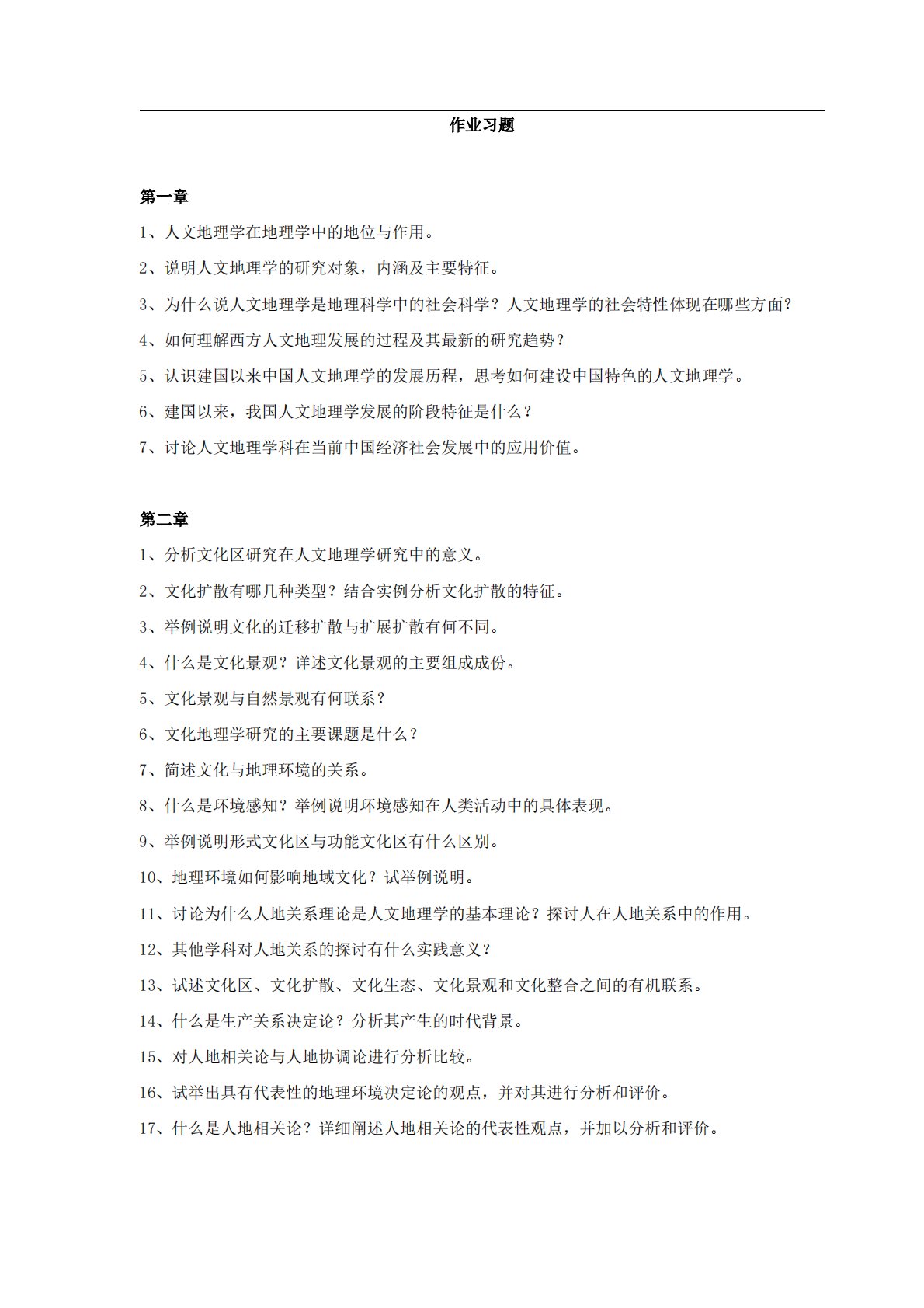 作业习题第一章1、人文地理学在地理学中的地位与作用。2、说明人文地理学的研究对象,内涵及主要特征。3、为什么说人文地理学是地理科学中的社会科学?人文地理学的社会特性体现在哪些方面?4、如何理解西方人文地理发展的过程及其最新的研究趋势?5、认识建国以来中国人文地理学的发展历程,思考如何建设中国特色的人文地理学。6、建国以来,我国人文地理学发展的阶段特征是什么?7、讨论人文地理学科在当前中国经济社会发展中的应用价值。第二章1、分析文化区研究在人文地理学研究中的意义。2、文化扩散有哪几种类型?结合实例分析文化扩散的特征。3、举例说明文化的迁移扩散与扩展扩散有何不同。4、什么是文化景观?详述文化景观的...