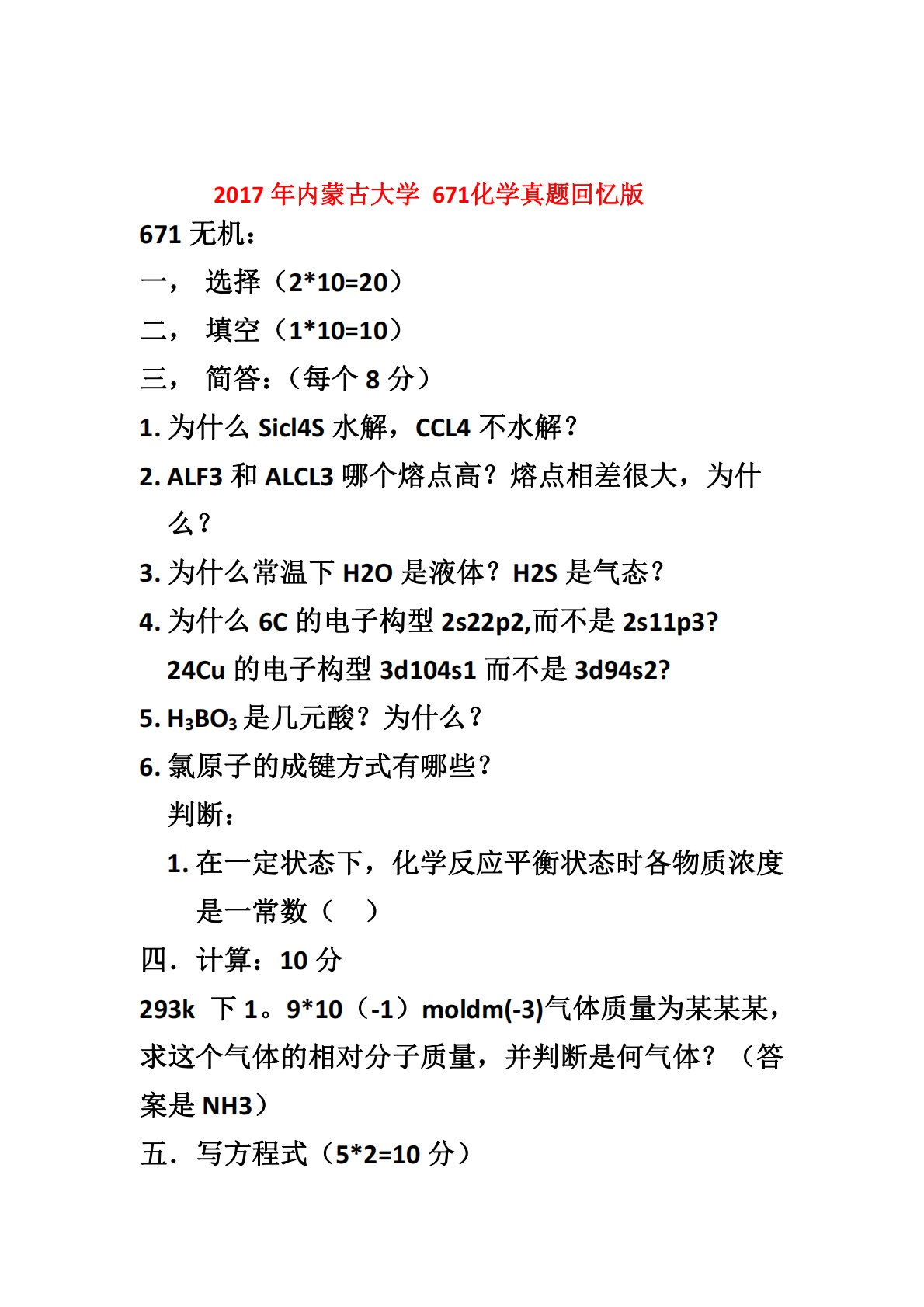671无机:一,选择(2*10=20)二,填空(1*10=10)三,简答:(每个8分)1.为什么Sicl4S水解,CCL4不水解?2.ALF3和ALCL3哪个熔点高?熔点相差很大,为2017年内蒙古大学671化学真题回忆版什么?3.为什么常温下H2O是液体?H2S是气态?4.为什么6C的电子构型2s22p2,而不是2s11p3?24Cu的电子构型3d104s1而不是3d94s2?5.H3BO3是几元酸?为什么?6.氯原子的成键方式有哪些?判断:1.在一定状态下,化学反应平衡状态时各物质浓度是一常数()四.计算:10分293k下1。9*10(-1)moldm(-3)气体质量为某某某,求这个气体的...