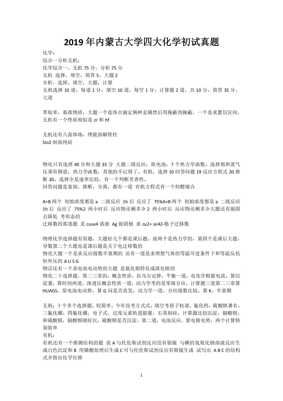12019年内蒙古大学四大化学初试真题化学:综合一分析无机:化学综合一,无机75分,分析75分无机选择,填空,简答5,大题2分析,选择,填空,大题,计算无机选择10道,每道1分,填空10道,每空1分,计算题2道,共10分,简答35分,七道萃取率,基准物质,大题一个是络合滴定俩种金属然后用掩蔽剂掩蔽,一个是求置信区间,无机有一个性质相似是zr和hf无机还有八面体场,绣能溶解铁柱Sio2制高纯硅物化只有选择40分和大题35分大题二级反应,原电池,7个热力学函数。选择饱和蒸气压那有俩道,热力学函数,其他的不记得了。有机,选择10回答问题19反应方程式20推断20。选择全是速率比较,有一个判断芳香性,...
