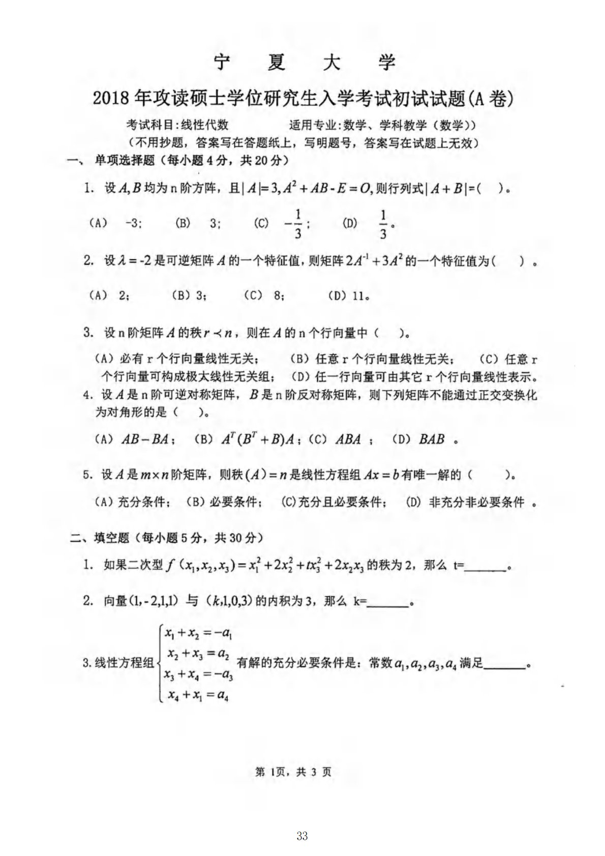 宁夏大学816高等代数2018年真题