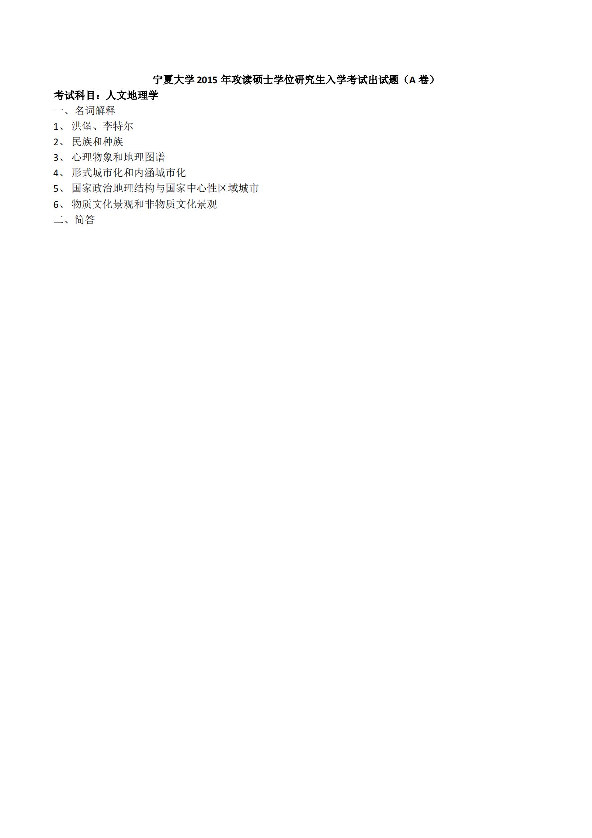 宁夏大学2015年攻读硕士学位研究生入学考试出试题(A卷)考试科目:人文地理学一、名词解释1、洪堡、李特尔2、民族和种族3、心理物象和地理图谱4、形式城市化和内涵城市化5、国家政治地理结构与国家中心性区域城市6、物质文化景观和非物质文化景观二、简答宁夏大学2015年攻读硕士学位研究生入学考试出试题(A卷)考试科目:人文地理学一、名词解释1、洪堡、李特尔2、民族和种族3、心理物象和地理图谱4、形式城市化和内涵城市化5、国家政治地理结构与国家中心性区域城市6、物质文化景观和非物质文化景观二、简答1、简述人地关系中主要学派的思想2、何为胡焕庸线,试分析其成因3、简述说明人文地理学研究的地理社会调查方...