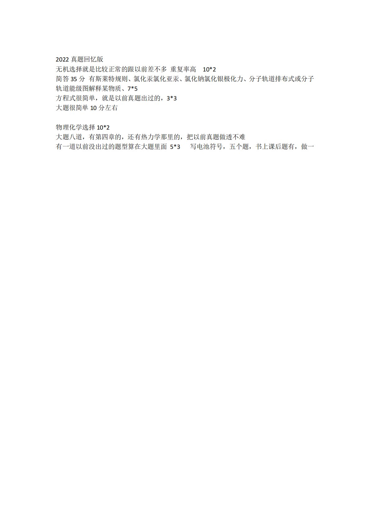 2022真题回忆版无机选择就是比较正常的跟以前差不多重复率高10*2简答35分有斯莱特规则、氯化汞氯化亚汞、氯化钠氯化银极化力、分子轨道排布式或分子轨道能级图解释某物质、7*5方程式很简单,就是以前真题出过的,3*3大题很简单10分左右物理化学选择10*2大题八道,有第四章的,还有热力学那里的,把以前真题做透不难有一道以前没出过的题型算在大题里面5*3写电池符号,五个题,书上课后题有,做一2022真题回忆版无机选择就是比较正常的跟以前差不多重复率高10*2简答35分有斯莱特规则、氯化汞氯化亚汞、氯化钠氯化银极化力、分子轨道排布式或分子轨道能级图解释某物质、7*5方程式很简单,就是以前真题出过的...