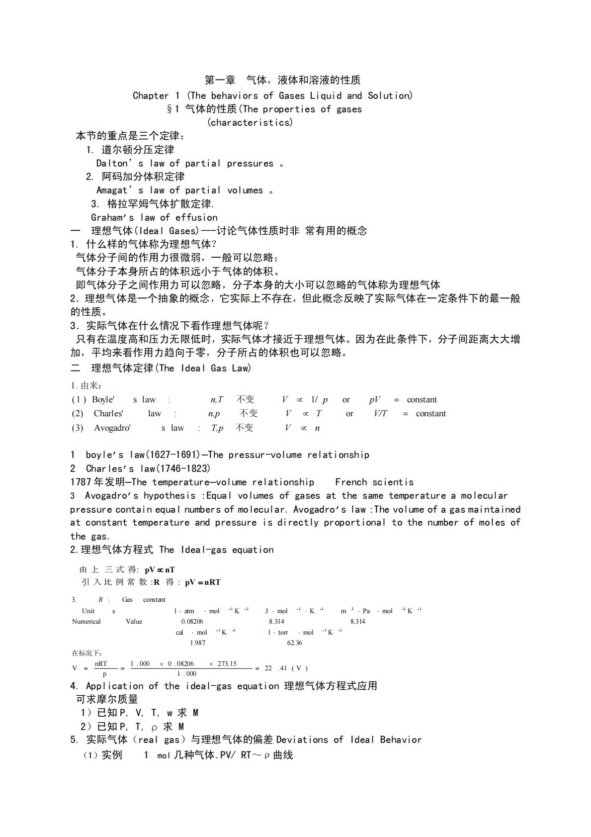 第一章气体,液体和溶液的性质Chapter1(ThebehaviorsofGasesLiquidandSolution)§1气体的性质(Thepropertiesofgases(characteristics)本节的重点是三个定律:1.道尔顿分压定律Dalton’slawofpartialpressures。2.阿码加分体积定律Amagat’slawofpartialvolumes。3.格拉罕姆气体扩散定律.Graham’slawofeffusion一理想气体(IdealGases)---讨论气体性质时非常有用的概念1.什么样的气体称为理想气体?气体分子间的作用力很微弱,一般可以忽略;气体分子...