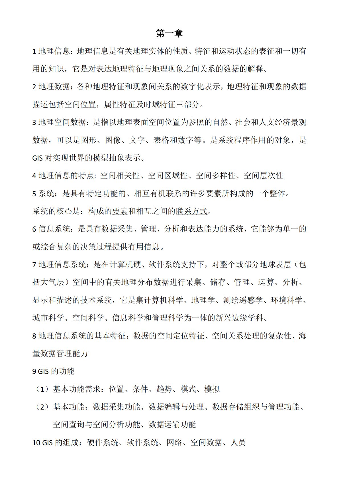第一章1地理信息:地理信息是有关地理实体的性质、特征和运动状态的表征和一切有用的知识,它是对表达地理特征与地理现象之间关系的数据的解释。2地理数据:各种地理特征和现象间关系的数字化表示,地理特征和现象的数据描述包括空间位置,属性特征及时域特征三部分。3地理空间数据:是指以地理表面空间位置为参照的自然、社会和人文经济景观数据,可以是图形、图像、文字、表格和数字等。是系统程序作用的对象,是GIS对实现世界的模型抽象表示。4地理信息的特点:空间相关性、空间区域性、空间多样性、空间层次性5系统:是具有特定功能的、相互有机联系的许多要素所构成的一个整体。系统的核心是:构成的要素和相互之间的联系方式。6信...