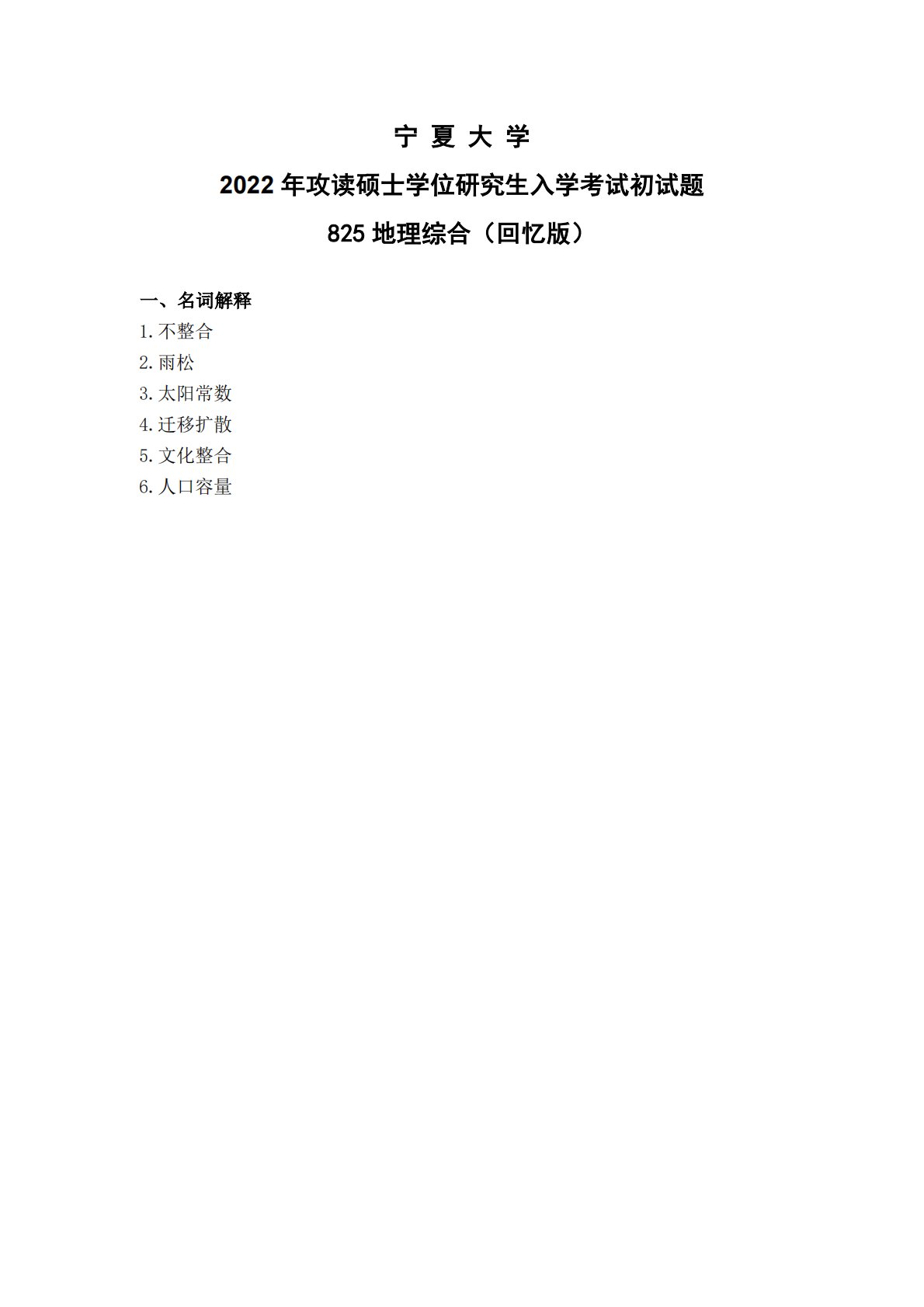 宁夏大学825地理综合2022年真题回忆版(人文地理)