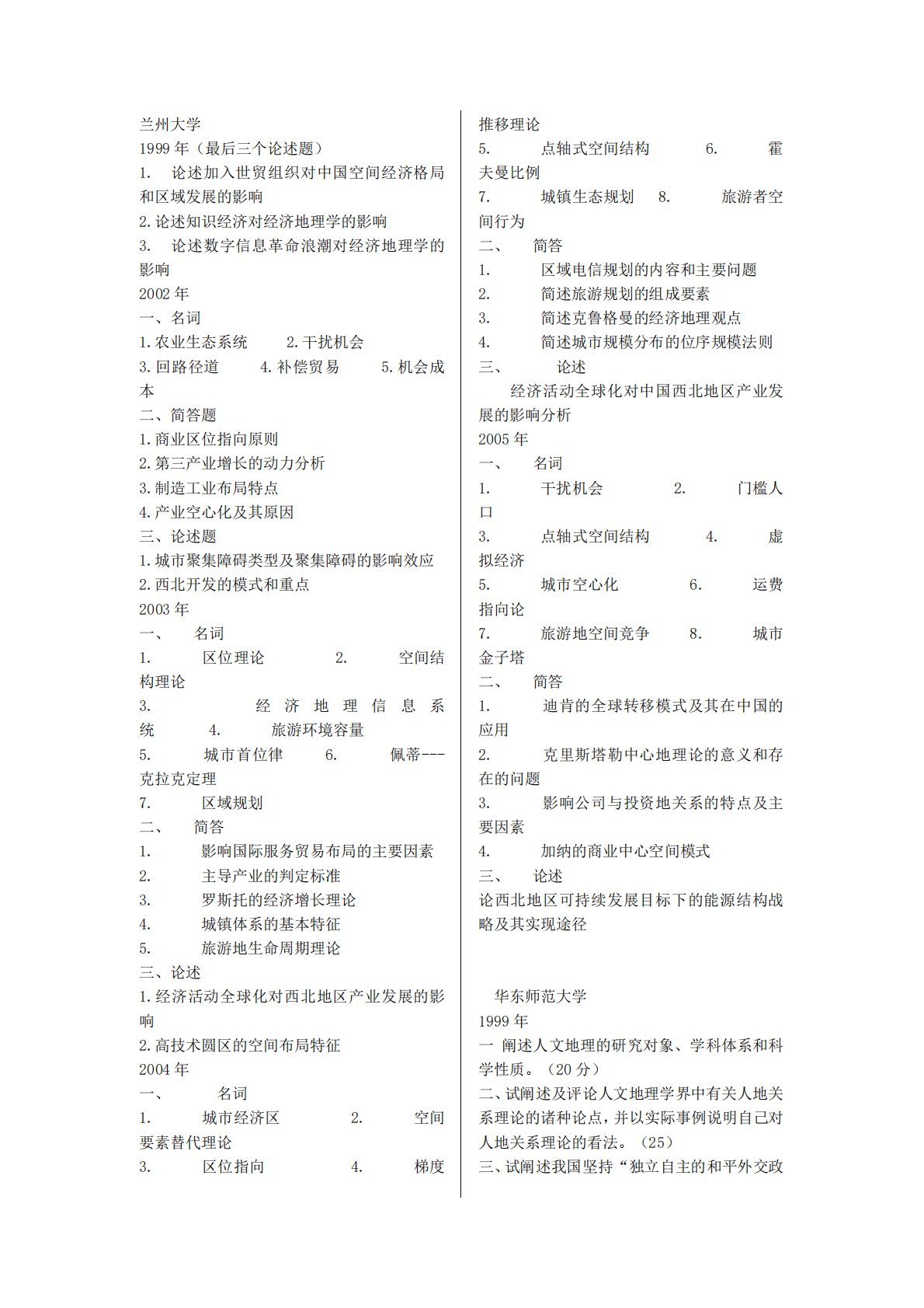 兰州大学1999年(最后三个论述题)1.论述加入世贸组织对中国空间经济格局和区域发展的影响2.论述知识经济对经济地理学的影响3.论述数字信息革命浪潮对经济地理学的影响2002年一、名词1.农业生态系统2.干扰机会3.回路径道4.补偿贸易5.机会成本二、简答题1.商业区位指向原则2.第三产业增长的动力分析3.制造工业布局特点4.产业空心化及其原因三、论述题1.城市聚集障碍类型及聚集障碍的影响效应2.西北开发的模式和重点2003年一、名词1.区位理论2.空间结构理论3.经济地理信息系统4.旅游环境容量5.城市首位律6.佩蒂---克拉克定理7.区域规划二、简答1.影响国际服务贸易布局的主要因素2.主...
