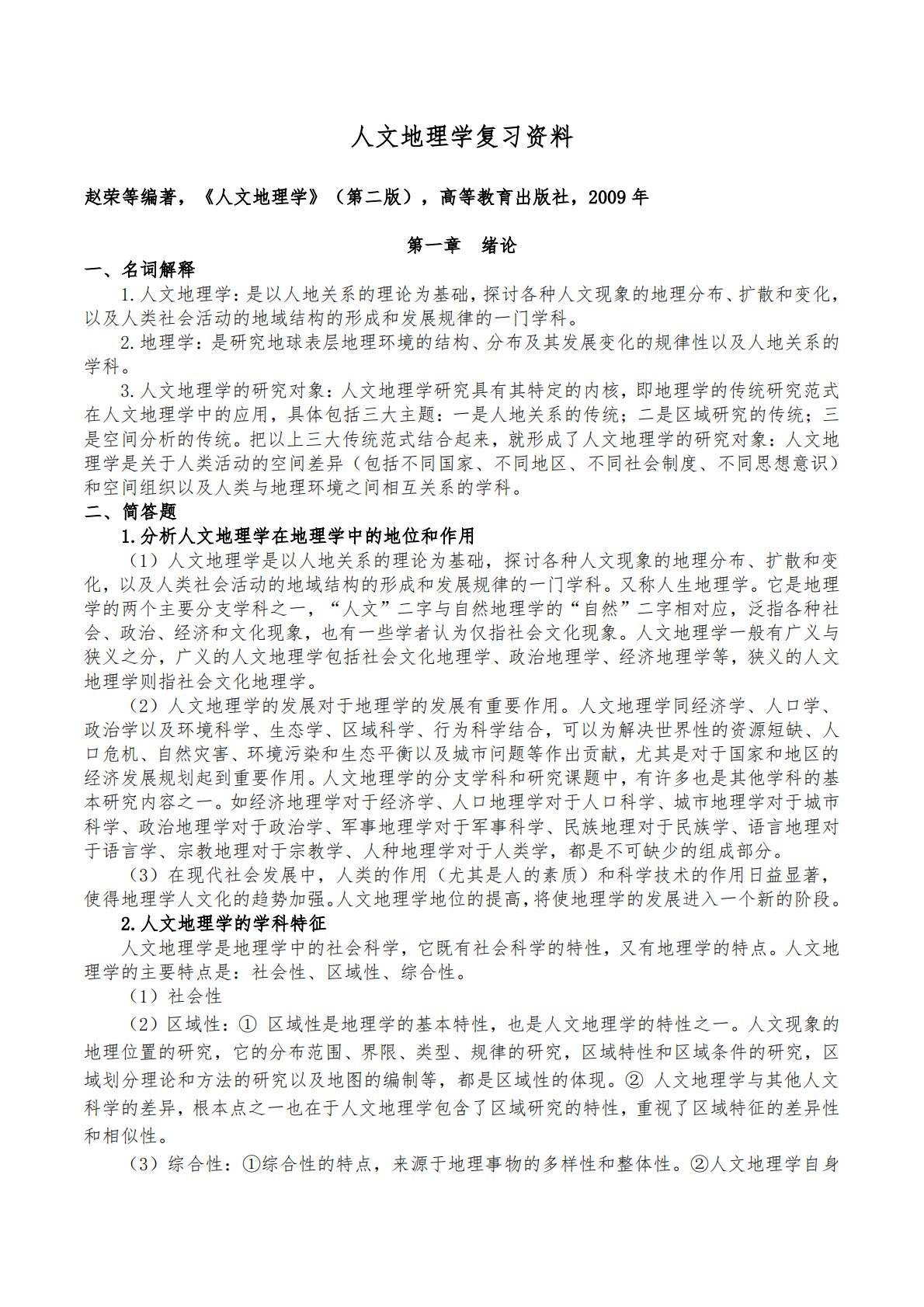 人文地理学复习资料赵荣等编著,《人文地理学》(第二版),高等教育出版社,2009年第一章绪论一、名词解释1.人文地理学:是以人地关系的理论为基础,探讨各种人文现象的地理分布、扩散和变化,以及人类社会活动的地域结构的形成和发展规律的一门学科。2.地理学:是研究地球表层地理环境的结构、分布及其发展变化的规律性以及人地关系的学科。3.人文地理学的研究对象:人文地理学研究具有其特定的内核,即地理学的传统研究范式在人文地理学中的应用,具体包括三大主题:一是人地关系的传统;二是区域研究的传统;三是空间分析的传统。把以上三大传统范式结合起来,就形成了人文地理学的研究对象:人文地理学是关于人类活动的空间差异(...