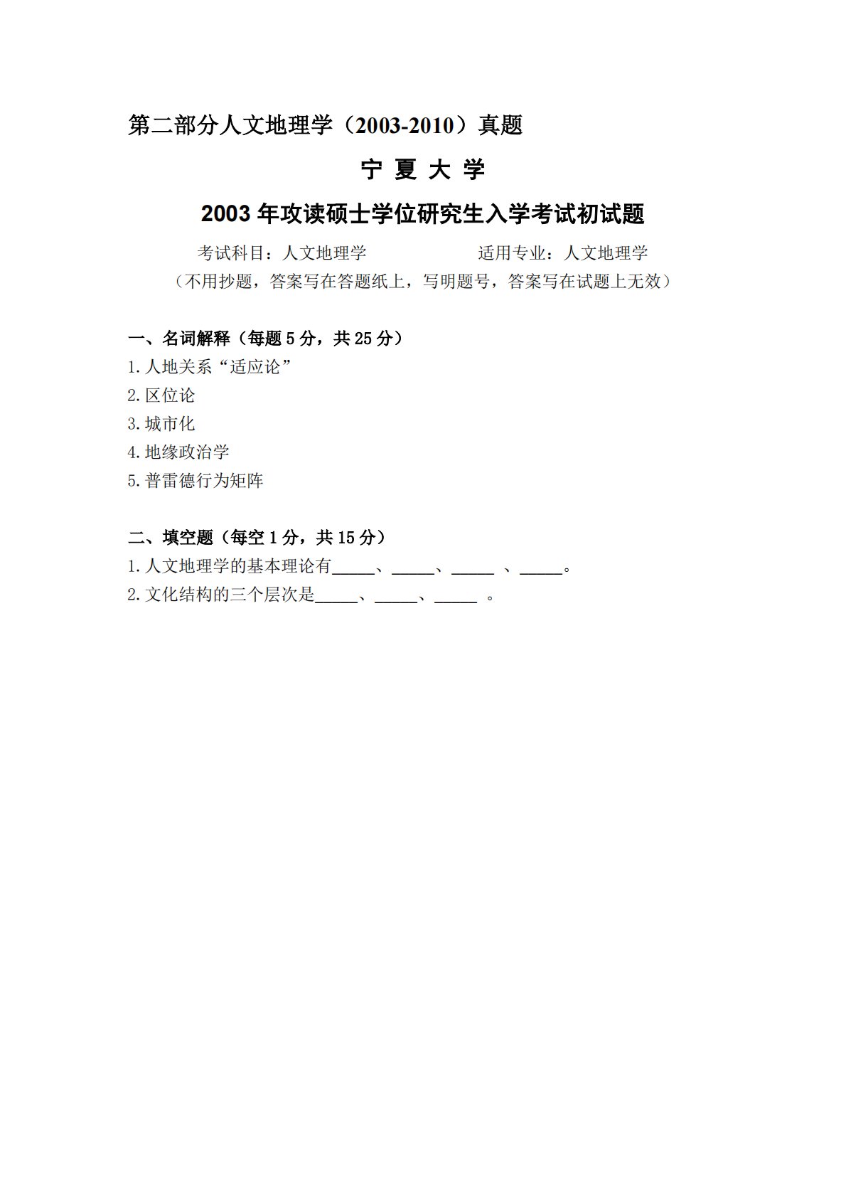 第二部分人文地理学(2003-2010)真题宁夏大学2003年攻读硕士学位研究生入学考试初试题考试科目:人文地理学适用专业:人文地理学(不用抄题,答案写在答题纸上,写明题号,答案写在试题上无效)一、名词解释(每题5分,共25分)1.人地关系“适应论”2.区位论3.城市化4.地缘政治学5.普雷德行为矩阵二、填空题(每空1分,共15分)1.人文地理学的基本理论有_____、_____、_____、_____。2.文化结构的三个层次是_____、_____、_____。第二部分人文地理学(2003-2010)真题宁夏大学2003年攻读硕士学位研究生入学考试初试题考试科目:人文地理学适用专业:人文地理...