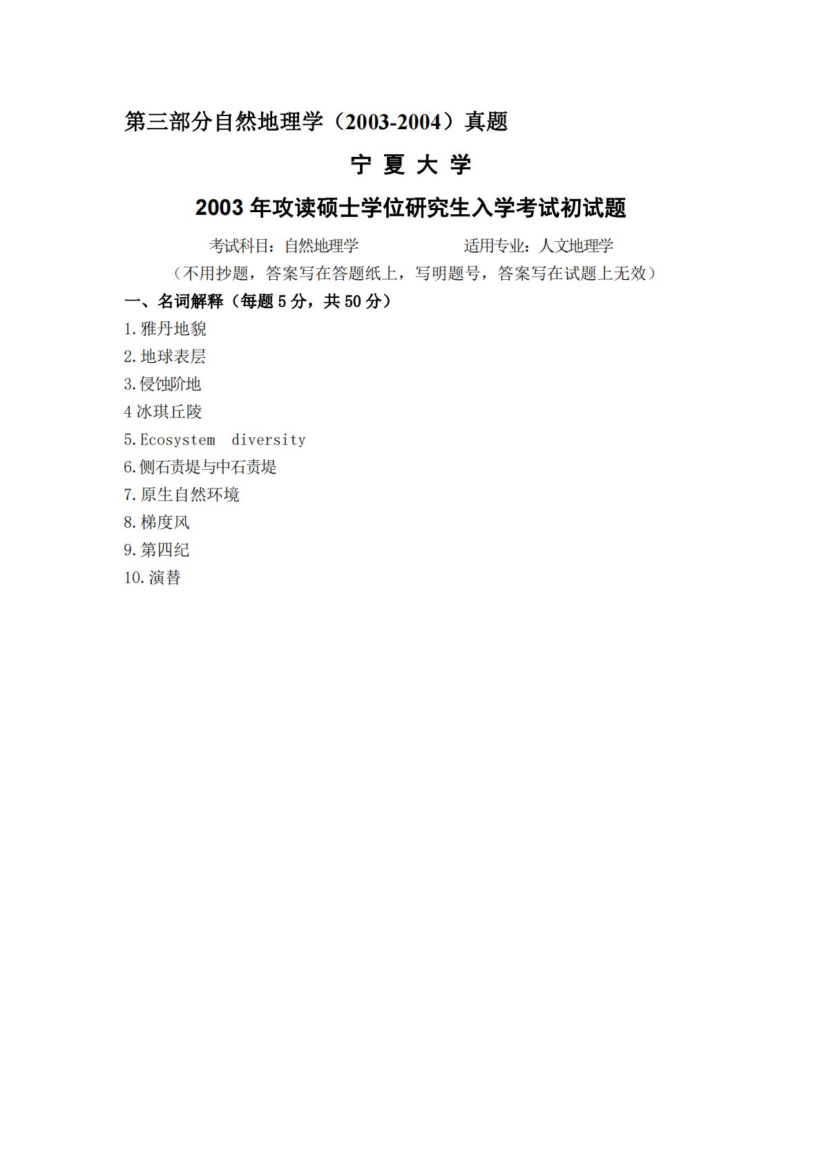 第三部分自然地理学(2003-2004)真题宁夏大学2003年攻读硕士学位研究生入学考试初试题考试科目:自然地理学适用专业:人文地理学(不用抄题,答案写在答题纸上,写明题号,答案写在试题上无效)一、名词解释(每题5分,共50分)1.雅丹地貌2.地球表层3.侵蚀阶地4冰琪丘陵5.Ecosystemdiversity6.侧石责堤与中石责堤7.原生自然环境8.梯度风9.第四纪10.演替第三部分自然地理学(2003-2004)真题宁夏大学2003年攻读硕士学位研究生入学考试初试题考试科目:自然地理学适用专业:人文地理学(不用抄题,答案写在答题纸上,写明题号,答案写在试题上无效)一、名词解释(每题5分,...
