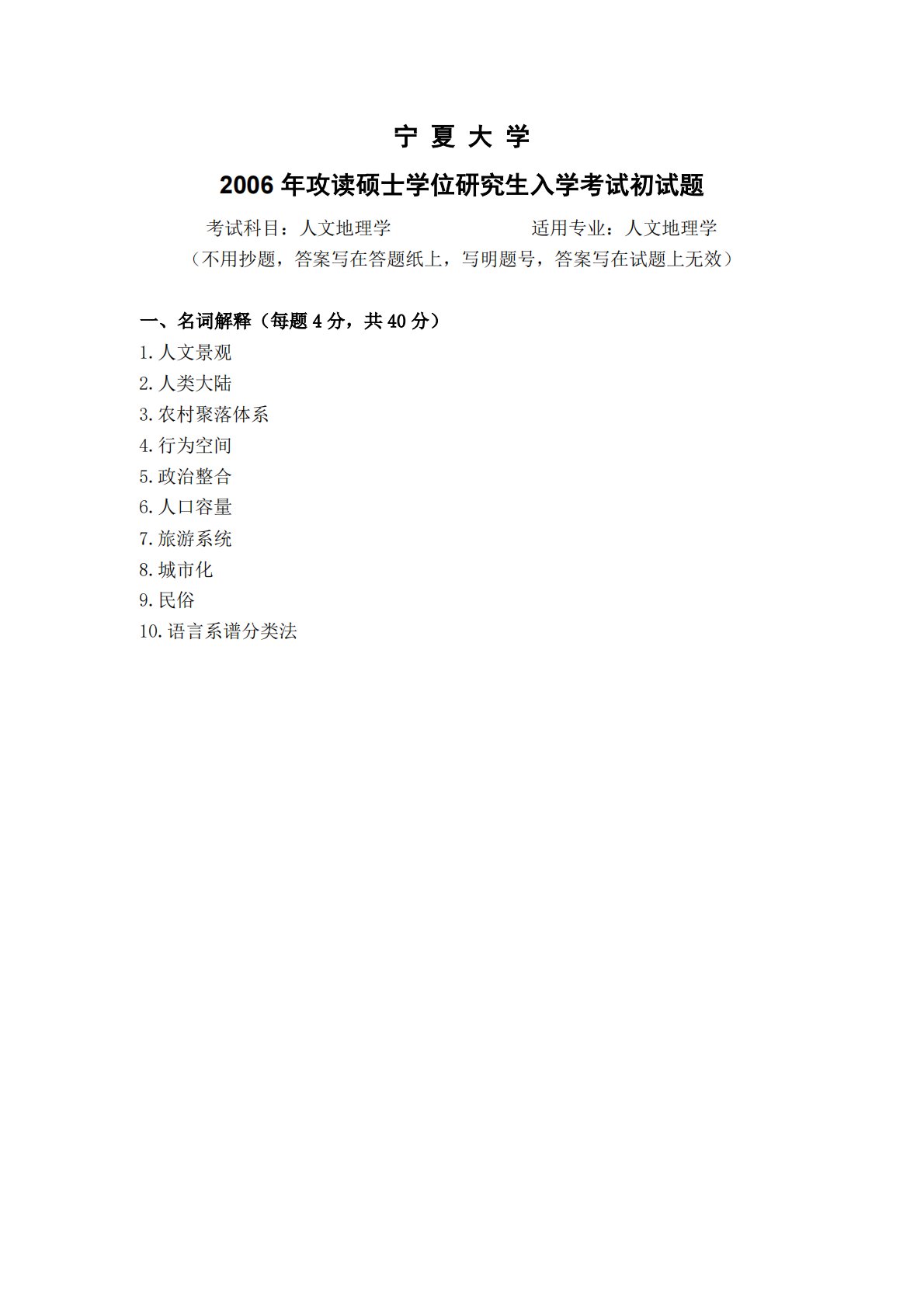 宁夏大学2006年攻读硕士学位研究生入学考试初试题考试科目:人文地理学适用专业:人文地理学(不用抄题,答案写在答题纸上,写明题号,答案写在试题上无效)一、名词解释(每题4分,共40分)1.人文景观2.人类大陆3.农村聚落体系4.行为空间5.政治整合6.人口容量7.旅游系统8.城市化9.民俗10.语言系谱分类法宁夏大学2006年攻读硕士学位研究生入学考试初试题考试科目:人文地理学适用专业:人文地理学(不用抄题,答案写在答题纸上,写明题号,答案写在试题上无效)一、名词解释(每题4分,共40分)1.人文景观2.人类大陆3.农村聚落体系4.行为空间5.政治整合6.人口容量7.旅游系统8.城市化9.民俗...