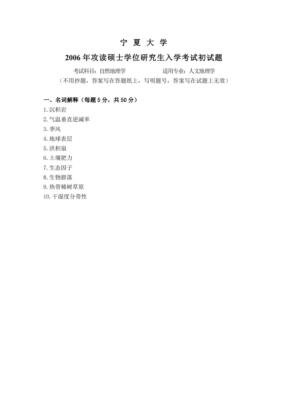 宁夏大学2006年攻读硕士学位研究生入学考试初试题考试科目:自然地理学适用专业:人文地理学(不用抄题,答案写在答题纸上,写明题号,答案写在试题上无效)一、名词解释(每题5分,共50分)1.沉积岩2.气温垂直逆减率3.季风4.地球表层5.洪积扇6.土壤肥力7.生态因子8.生物群落9.热带稀树草原10.干湿度分带性宁夏大学2006年攻读硕士学位研究生入学考试初试题考试科目:自然地理学适用专业:人文地理学(不用抄题,答案写在答题纸上,写明题号,答案写在试题上无效)一、名词解释(每题5分,共50分)1.沉积岩2.气温垂直逆减率3.季风4.地球表层5.洪积扇6.土壤肥力7.生态因子8.生物群落9.热带稀...