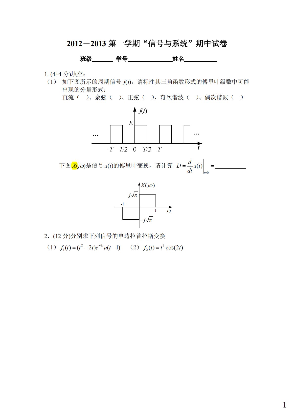 2012-2013第一学期“信号与系统”期中试卷班级学号姓名1.(4+4分)填空:(1)如下图所示的周期信号f(t),请标注其三角函数形式的傅里叶级数中可能出现的分量形式:直流()、余弦()、正弦()、奇次谐波()、偶次谐波()下图X(jw)是信号x(t)的傅里叶变换,请计算0()tdDxtdt===-11jpjp-w()Xjw2.(12分)分别求下列信号的单边拉普拉斯变换(1)221()(2)(1)tfttteut-=--(2)22()cos(2)fttt=13.(10分)已知212()()(1),()()tftututfteut-=--=,求卷积12()()ftft*4.(20分)分别求下...