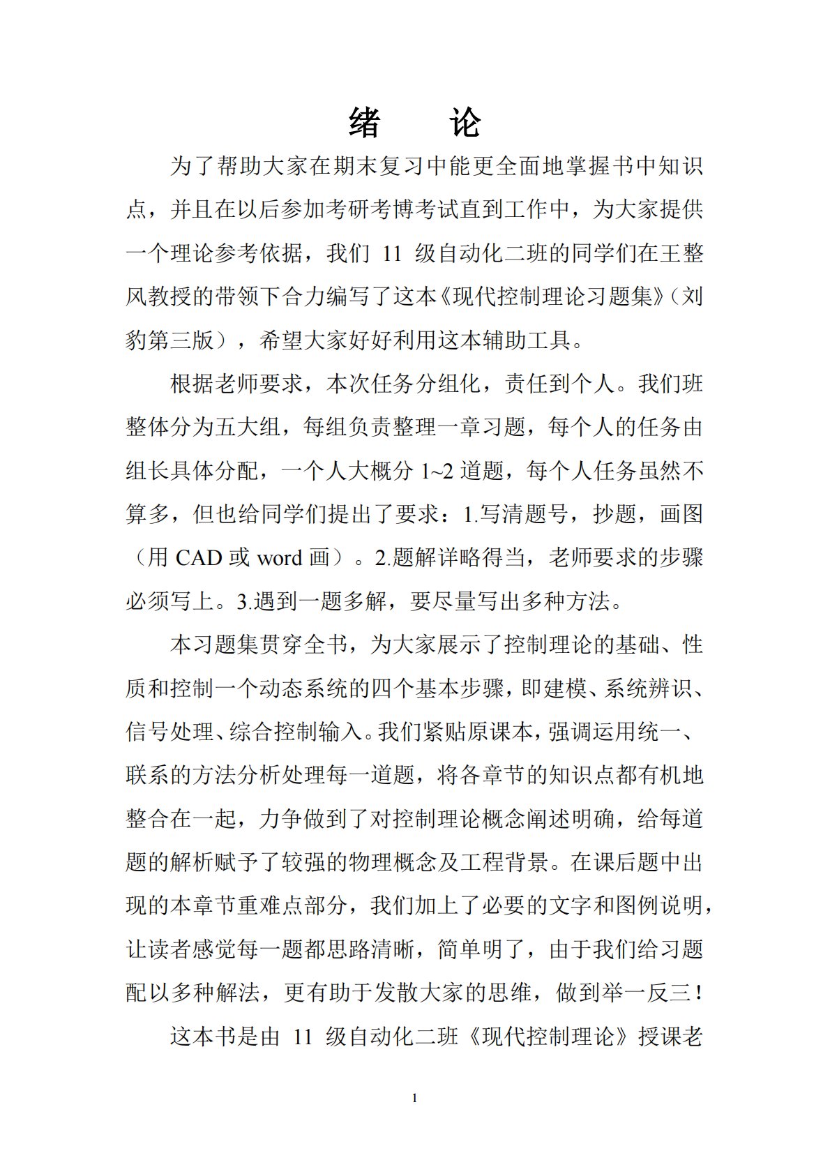11绪论为了帮助大家在期末复习中能更全面地掌握书中知识点,并且在以后参加考研考博考试直到工作中,为大家提供一个理论参考依据,我们11级自动化二班的同学们在王整风教授的带领下合力编写了这本《现代控制理论习题集》(刘豹第三版),希望大家好好利用这本辅助工具。根据老师要求,本次任务分组化,责任到个人。我们班整体分为五大组,每组负责整理一章习题,每个人的任务由组长具体分配,一个人大概分1~2道题,每个人任务虽然不算多,但也给同学们提出了要求:1.写清题号,抄题,画图(用CAD或word画)。2.题解详略得当,老师要求的步骤必须写上。3.遇到一题多解,要尽量写出多种方法。本习题集贯穿全书,为大家展示了控...