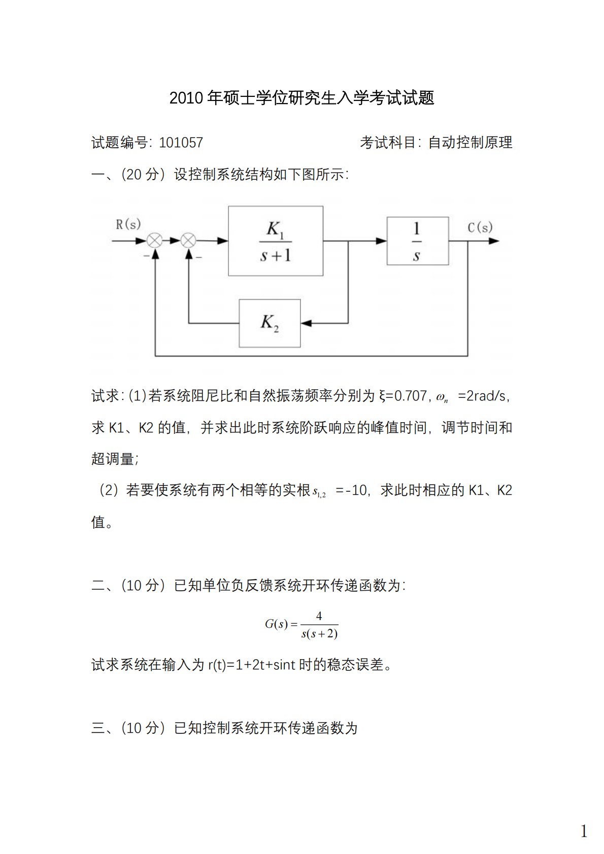 2010年硕士学位研究生入学考试试题试题编号:101057考试科目:自动控制原理一、(20分)设控制系统结构如下图所示:试求:(1)若系统阻尼比和自然振荡频率分别为ξ=0.707,nω=2rad/s,求K1、K2的值,并求出此时系统阶跃响应的峰值时间,调节时间和超调量;(2)若要使系统有两个相等的实根1,2s=-10,求此时相应的K1、K2值。二、(10分)已知单位负反馈系统开环传递函数为:4()(2)Gsss=+试求系统在输入为r(t)=1+2t+sint时的稳态误差。三、(10分)已知控制系统开环传递函数为1(3)()(),0(1)KsGsHsKss+=>−试绘制系统开环幅相曲线,并利用奈...