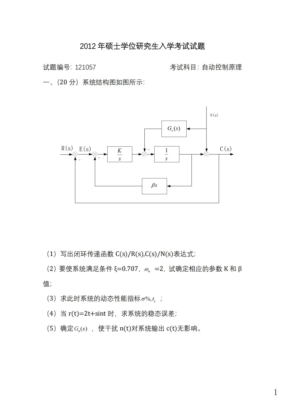 2012年硕士学位研究生入学考试试题试题编号:121057考试科目:自动控制原理一、(20分)系统结构图如图所示:(1)写出闭环传递函数C(s)/R(s),C(s)/N(s)表达式;(2)要使系统满足条件ξ=0.707,nω=2,试确定相应的参数K和β值;(3)求此时系统的动态性能指标%,sts;(4)当r(t)=2t+sint时,求系统的稳态误差;(5)确定()nGs,使干扰n(t)对系统输出c(t)无影响。1二、(10分)已知某单位反馈系统的开环传递函数0.8()1sKeGss−=+,试确定系统稳定的K值范围。三、(15分)已知某单位反馈系统的开环传递函数(1)()()(3)KsGsHss...
