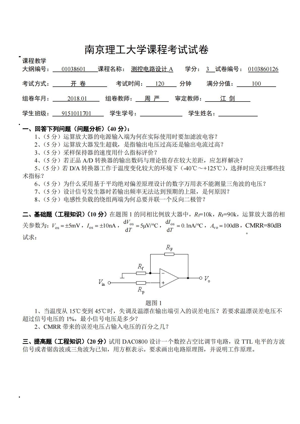 南京理工大学880信号与测控系统2015级测控电路设计试卷