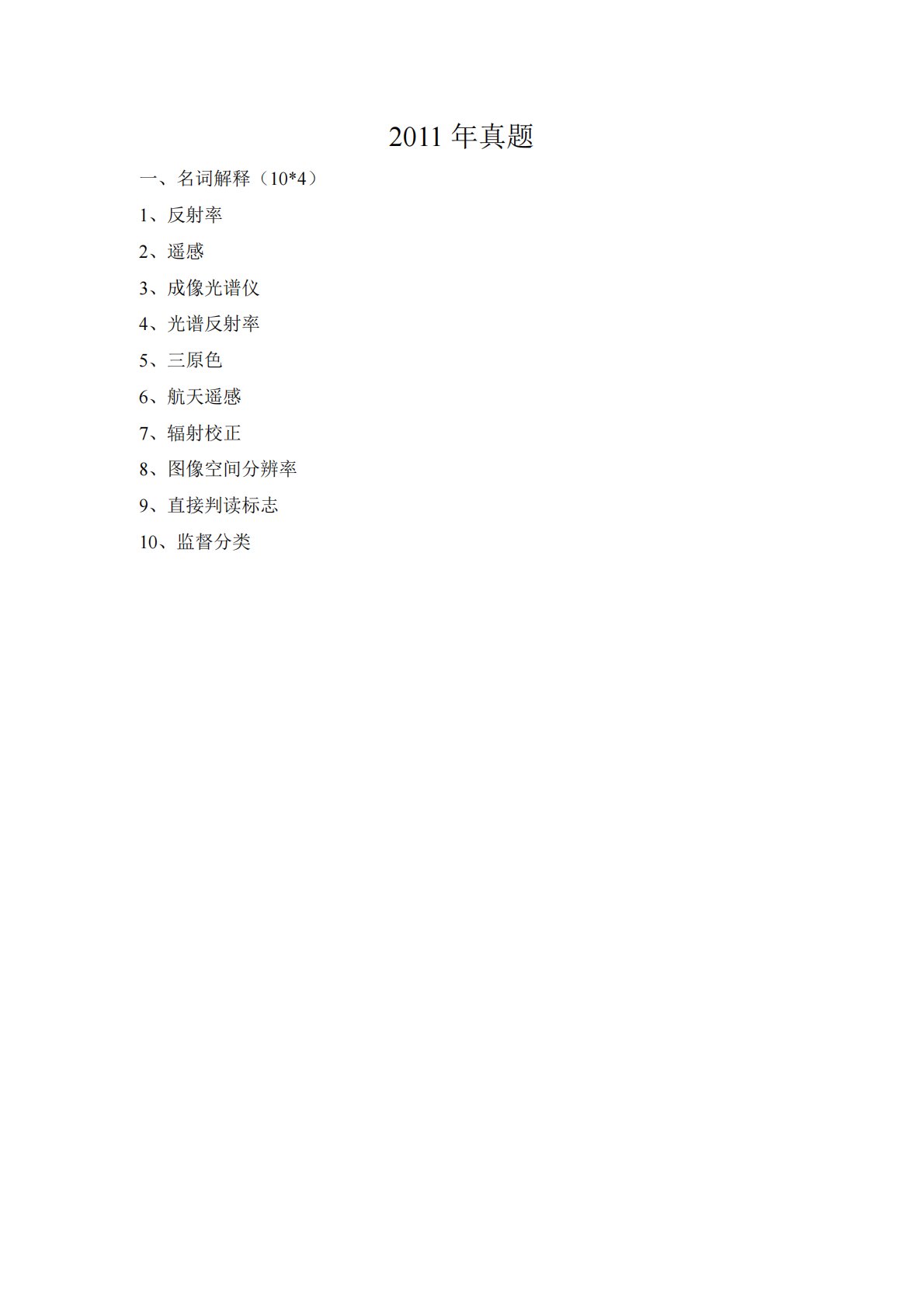 2011年真题一、名词解释(10*4)1、反射率2、遥感3、成像光谱仪4、光谱反射率5、三原色6、航天遥感7、辐射校正8、图像空间分辨率9、直接判读标志10、监督分类2011年真题一、名词解释(10*4)1、反射率2、遥感3、成像光谱仪4、光谱反射率5、三原色6、航天遥感7、辐射校正8、图像空间分辨率9、直接判读标志10、监督分类二、简答题(5*10)1、简述影响地物光谱反射率变化的因素2、简述绿色植被的反射波谱特征3、平行(垂直)投影和中心投影的联系4、微波遥感有哪些特征5、遥感图像的监督分类和非监督分类异同三、问答题(3*20)1、论述影响遥感图像目视判读的主要因素2、论述遥感图像的校正的...
