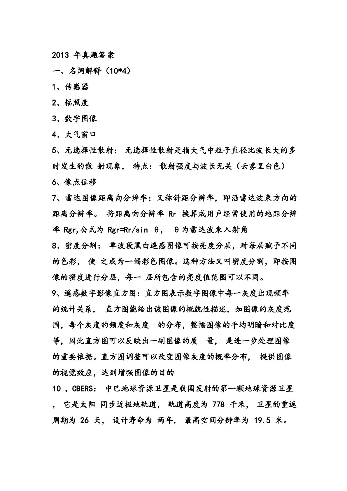 2013年真题答案一、名词解释(10*4)1、传感器2、辐照度3、数字图像4、大气窗口5、无选择性散射:无选择性散射是指大气中粒子直径比波长大的多时发生的散射现象,特点:散射强度与波长无关(云雾呈白色)6、像点位移7、雷达图像距离向分辨率:又称斜距分辨率,即沿雷达波束方向的距离分辨率。将距离向分辨率Rr换算成用户经常使用的地距分辨率Rgr,公式为Rgr=Rr/sinθ,θ为雷达波束入射角8、密度分割:单波段黑白遥感图像可按亮度分层,对每层赋予不同的色彩,使之成为一幅彩色图像。这种方法又叫密度分割,即按图像的密度进行分层,每一层所包含的亮度值范围可以不同。9、遥感数字影像直方图:直方图表示数字图...