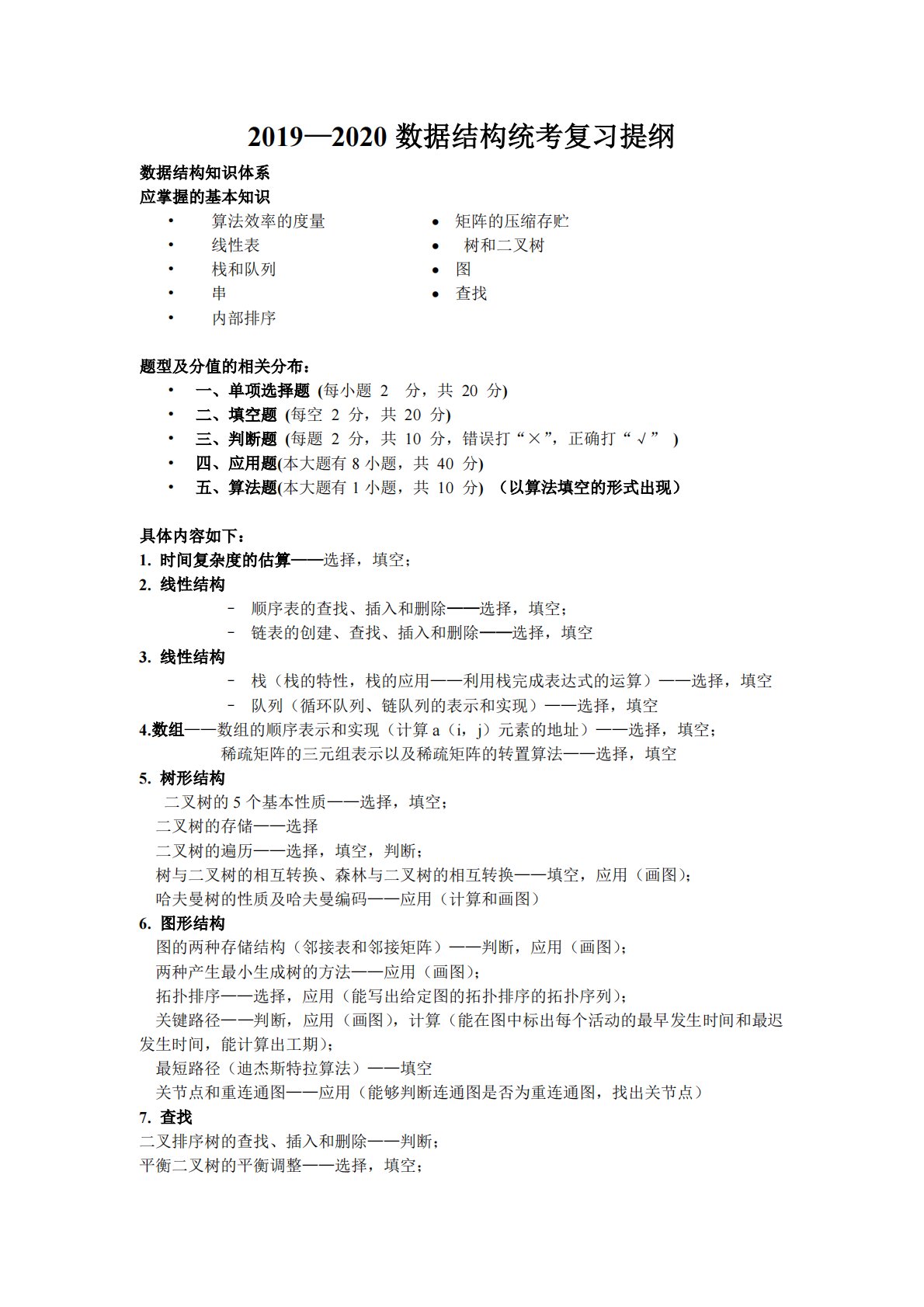 2019—2020数据结构统考复习提纲数据结构知识体系应掌握的基本知识•算法效率的度量矩阵的压缩存贮•线性表树和二叉树•栈和队列图•串查找•内部排序题型及分值的相关分布:•一、单项选择题(每小题2分,共20分)•二、填空题(每空2分,共20分)•三、判断题(每题2分,共10分,错误打“×”,正确打“√”)•四、应用题(本大题有8小题,共40分)•五、算法题(本大题有1小题,共10分)(以算法填空的形式出现)具体内容如下:1.时间复杂度的估算——选择,填空;2.线性结构–顺序表的查找、插入和删除——选择,填空;–链表的创建、查找、插入和删除——选择,填空3.线性结构–栈(栈的特性,栈的应...