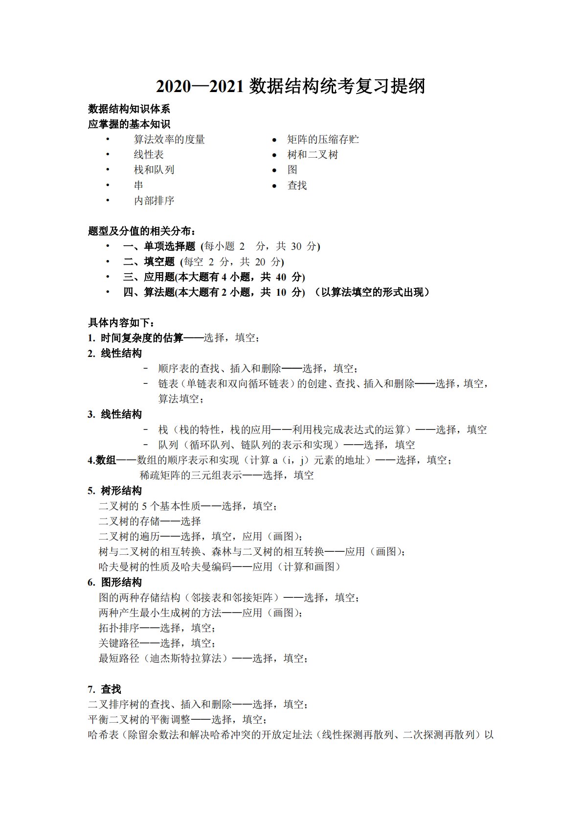 2020—2021数据结构统考复习提纲数据结构知识体系应掌握的基本知识•算法效率的度量矩阵的压缩存贮•线性表树和二叉树•栈和队列图•串查找•内部排序题型及分值的相关分布:•一、单项选择题(每小题2分,共30分)•二、填空题(每空2分,共20分)•三、应用题(本大题有4小题,共40分)•四、算法题(本大题有2小题,共10分)(以算法填空的形式出现)具体内容如下:1.时间复杂度的估算——选择,填空;2.线性结构–顺序表的查找、插入和删除——选择,填空;–链表(单链表和双向循环链表)的创建、查找、插入和删除——选择,填空,算法填空;3.线性结构–栈(栈的特性,栈的应用——利用栈完成表达式的运...
