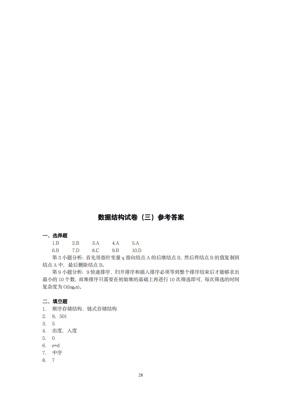 28数据结构试卷(三)参考答案一、选择题1.B2.B3.A4.A5.A6.B7.D8.C9.B10.D第3小题分析:首先用指针变量q指向结点A的后继结点B,然后将结点B的值复制到结点A中,最后删除结点B。第9小题分析:9快速排序、归并排序和插入排序必须等到整个排序结束后才能够求出最小的10个数,而堆排序只需要在初始堆的基础上再进行10次筛选即可,每次筛选的时间复杂度为O(log2n)。二、填空题1.顺序存储结构、链式存储结构2.9,5013.54.出度,入度5.06.e=d7.中序8.7299.O(1)10.i/2,2i+111.(5,16,71,23,72,94,73)12.(1,4,3,2...