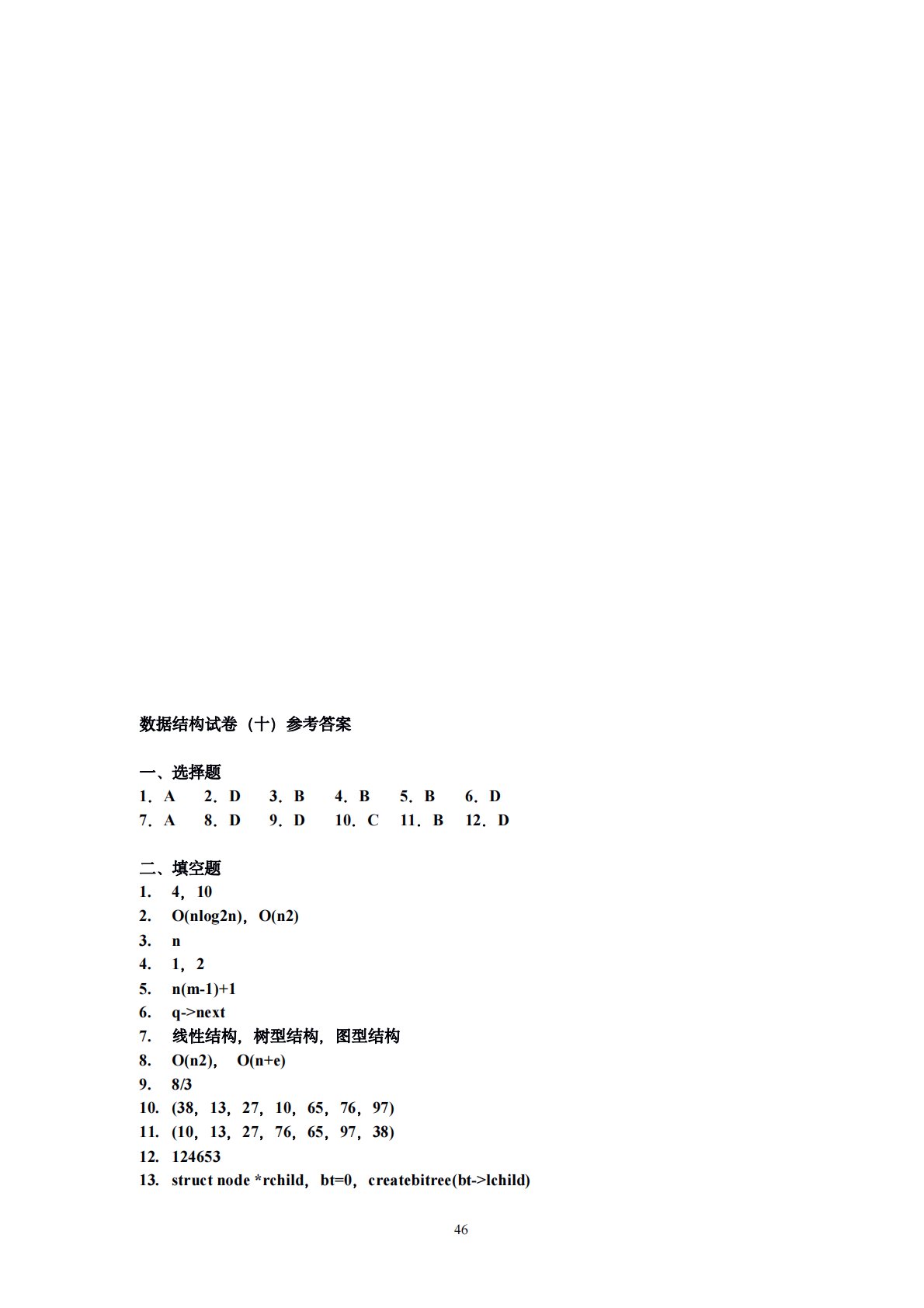 46数据结构试卷(十)参考答案一、选择题1.A2.D3.B4.B5.B6.D7.A8.D9.D10.C11.B12.D二、填空题1.4,102.O(nlog2n),O(n2)3.n4.1,25.n(m-1)+16.q->next7.线性结构,树型结构,图型结构8.O(n2),O(n+e)9.8/310.(38,13,27,10,65,76,97)11.(10,13,27,76,65,97,38)12.12465313.structnode*rchild,bt=0,createbitree(bt->lchild)4714.lklist,q=p三、算法设计题1.设计在链式存储结构上合并排序的算法。...