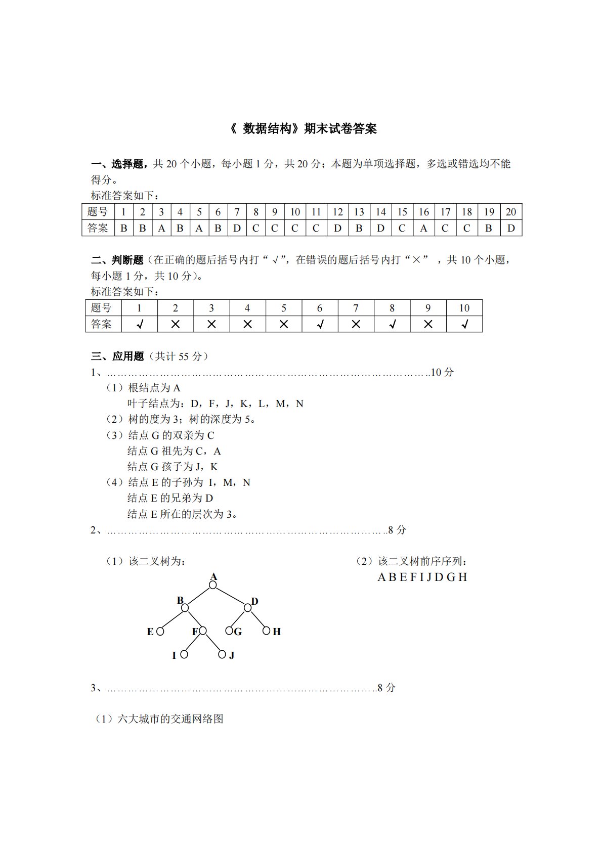 《数据结构》期末试卷答案一、选择题,共20个小题,每小题1分,共20分;本题为单项选择题,多选或错选均不能得分。标准答案如下:题号1234567891011121314151617181920答案BBABABDCCCCDBDCACCBD二、判断题(在正确的题后括号内打“√”,在错误的题后括号内打“×”,共10个小题,每小题1分,共10分)。标准答案如下:题号12345678910答案√××××√×√×√三、应用题(共计55分)1、………………………………………………………………………………..10分(1)根结点为A叶子结点为:D,F,J,K,L,M,N(2)树的度为3;树的深度为5。(3)结点...
