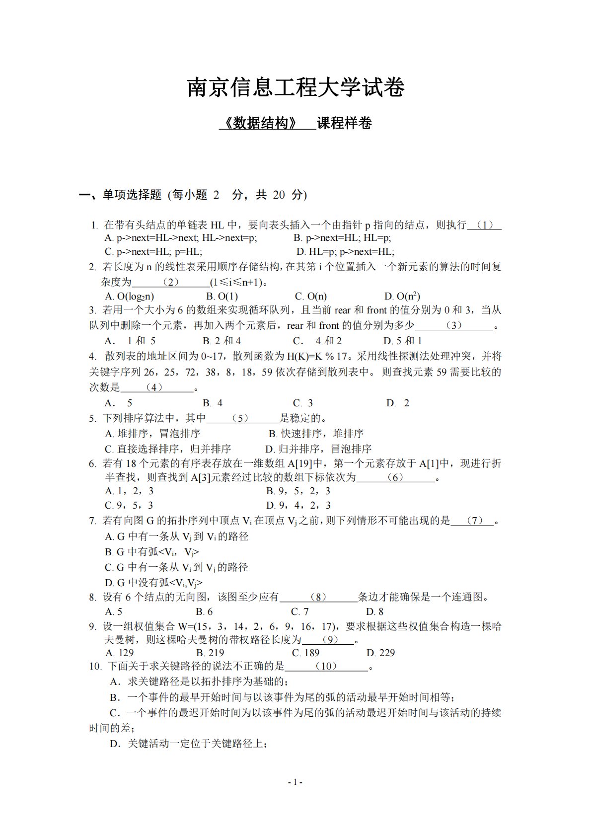 -1-南京信息工程大学试卷《数据结构》课程样卷一、单项选择题(每小题2分,共20分)1.在带有头结点的单链表HL中,要向表头插入一个由指针p指向的结点,则执行(1)A.p->next=HL->next;HL->next=p;B.p->next=HL;HL=p;C.p->next=HL;p=HL;D.HL=p;p->next=HL;2.若长度为n的线性表采用顺序存储结构,在其第i个位置插入一个新元素的算法的时间复杂度为(2)(1≤i≤n+1)。A.O(log2n)B.O(1)C.O(n)D.O(n2)3.若用一个大小为6的数组来实现循环队列,且当前rear和front的值分别为0和3,当从队列中...