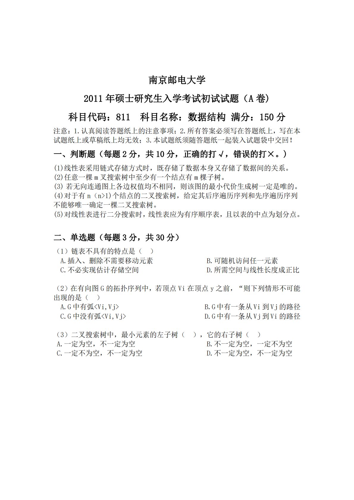南京邮电大学2011年硕士研究生入学考试初试试题(A卷)科目代码:811科目名称:数据结构满分:150分注意:1.认真阅读答题纸上的注意事项;2.所有答案必须写在答题纸上,写在本试题纸上或草稿纸上均无效;3.本试题纸须随答题纸一起装入试题袋中交回!一、判断题(每题2分,共10分,正确的打√,错误的打×。)(1)线性表采用链式存储方式时,既存储了数据本身又存储了数据间的关系。(2)任意一棵m叉搜索树中至少有一个结点有m棵子树。(3)若无向连通图上各边权值均不相同,则该图的最小代价生成树一定是唯的。(4)对于有n(n>1)个结点的二叉搜索树,给定其后序遍历序列和先序遍历序列不能够唯一确定一棵二叉搜...