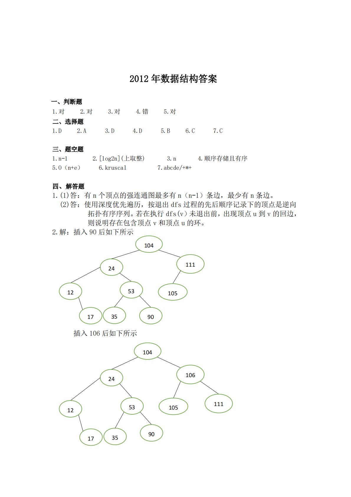 2.对3.对4.错5.对二、选择题1.D2.A3.D4.D5.B6.C7.C三、题空题1.n-12.[log2n](上取整)3.n4.顺序存储且有序5.O(n+e)四、解答题6.kruscal7.abcde/+*+1.(1)答:有n个顶点的强连通图最多有n(n-1)条边,最少有n条边。(2)答:使用深度优先遍历,按退出dfs过程的先后顺序记录下的顶点是逆向拓扑有序序列。若在执行dfs(v)未退出前,出现顶点u到v的回边,则说明存在包含顶点v和顶点u的环。2.解:插入90后如下所示插入106后如下所示353524104241115312105901710410611112105531790201...