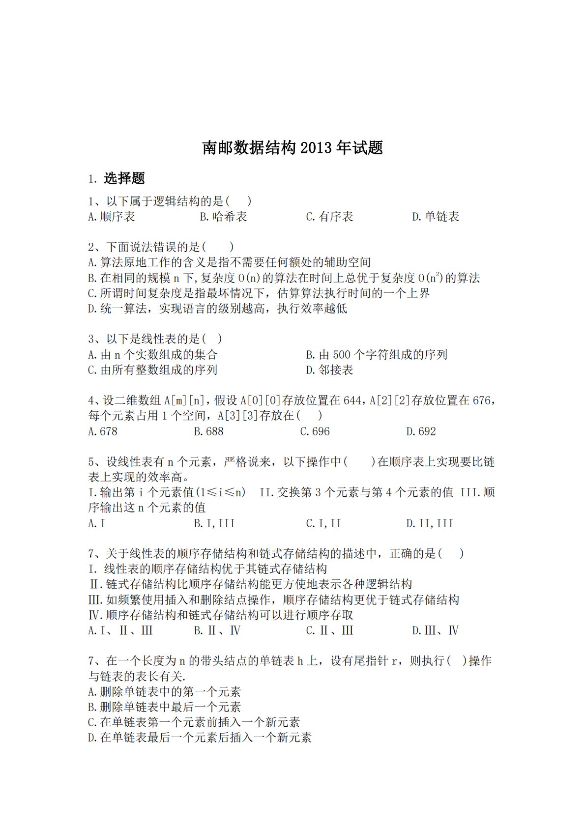 南邮数据结构2013年试题1.选择题1、以下属于逻辑结构的是()A.顺序表B.哈希表C.有序表D.单链表2、下面说法错误的是()A.算法原地工作的含义是指不需要任何额处的辅助空间B.在相同的规模n下,复杂度O(n)的算法在时间上总优于复杂度O(n2)的算法C.所谓时间复杂度是指最坏情况下,估算算法执行时间的一个上界D.统一算法,实现语言的级别越高,执行效率越低3、以下是线性表的是()A.由n个实数组成的集合B.由500个字符组成的序列C.由所有整数组成的序列D.邻接表4、设二维数组A[m][n],假设A[0][0]存放位置在644,A[2][2]存放位置在676,每个元素占用1个空间,A[3]...