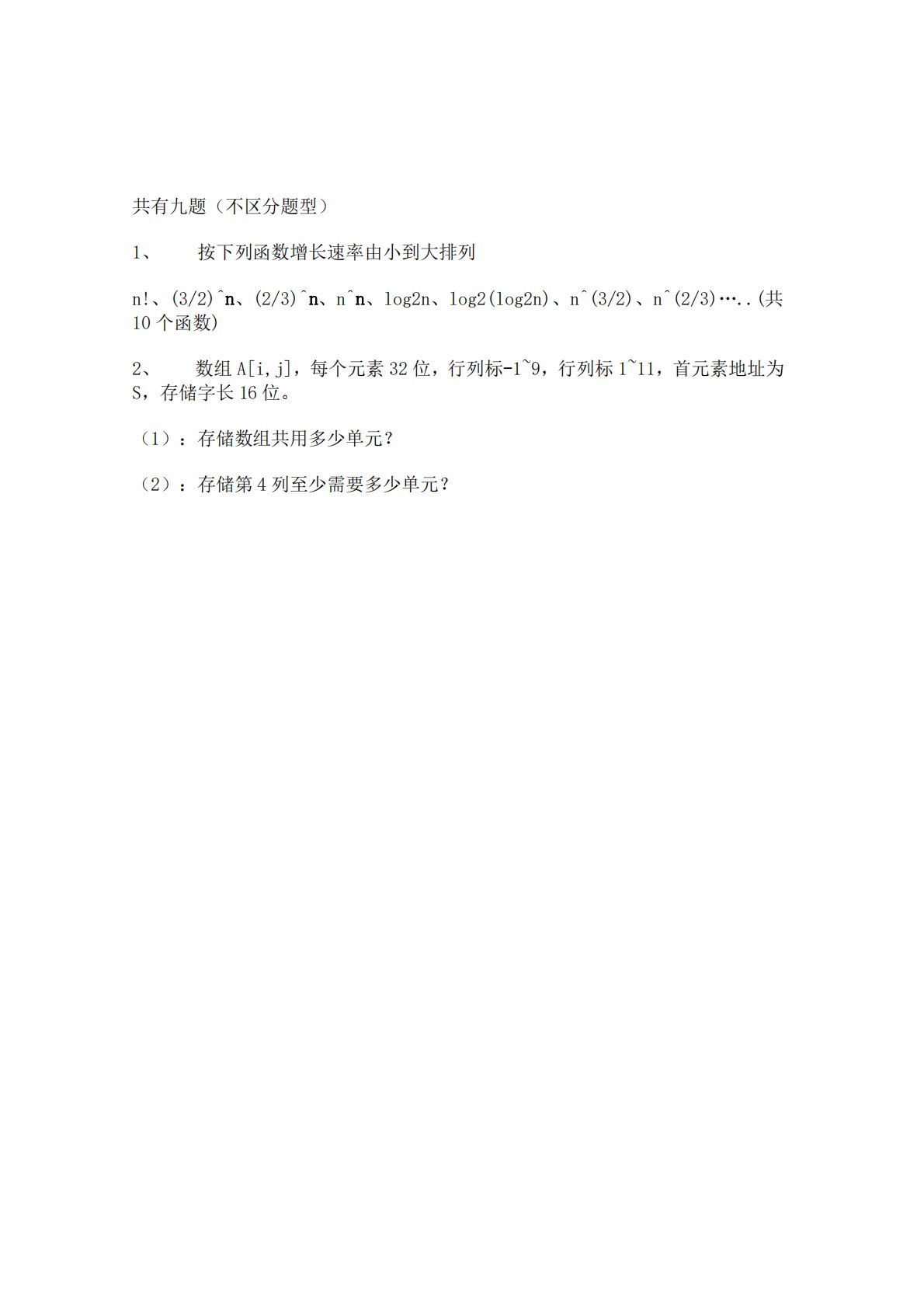 共有九题(不区分题型)1、按下列函数增长速率由小到大排列n!、(3/2)^n、(2/3)^n、n^n、log2n、log2(log2n)、n^(3/2)、n^(2/3)…..(共10个函数)2、数组A[i,j],每个元素32位,行列标-1~9,行列标1~11,首元素地址为S,存储字长16位。(1):存储数组共用多少单元?(2):存储第4列至少需要多少单元?共有九题(不区分题型)1、按下列函数增长速率由小到大排列n!、(3/2)^n、(2/3)^n、n^n、log2n、log2(log2n)、n^(3/2)、n^(2/3)…..(共10个函数)2、数组A[i,j],每个元素32位,行列标-1~9...