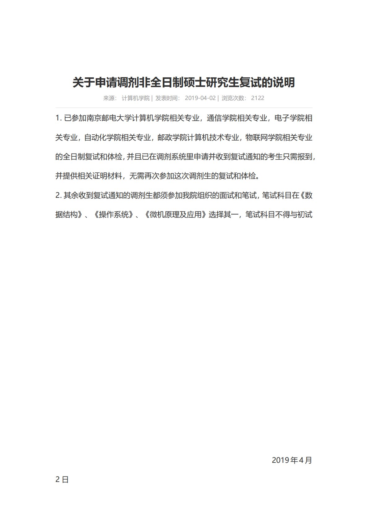 关于申请调剂非全日制硕士研究生复试的说明来源:计算机学院|发表时间:2019-04-02|浏览次数:21221.已参加南京邮电大学计算机学院相关专业,通信学院相关专业,电子学院相关专业,自动化学院相关专业,邮政学院计算机技术专业,物联网学院相关专业的全日制复试和体检,并且已在调剂系统里申请并收到复试通知的考生只需报到,并提供相关证明材料,无需再次参加这次调剂生的复试和体检。2.其余收到复试通知的调剂生都须参加我院组织的面试和笔试,笔试科目在《数据结构》、《操作系统》、《微机原理及应用》选择其一,笔试科目不得与初试2019年4月2日关于申请调剂非全日制硕士研究生复试的说明来源:计算机学院|发表时...