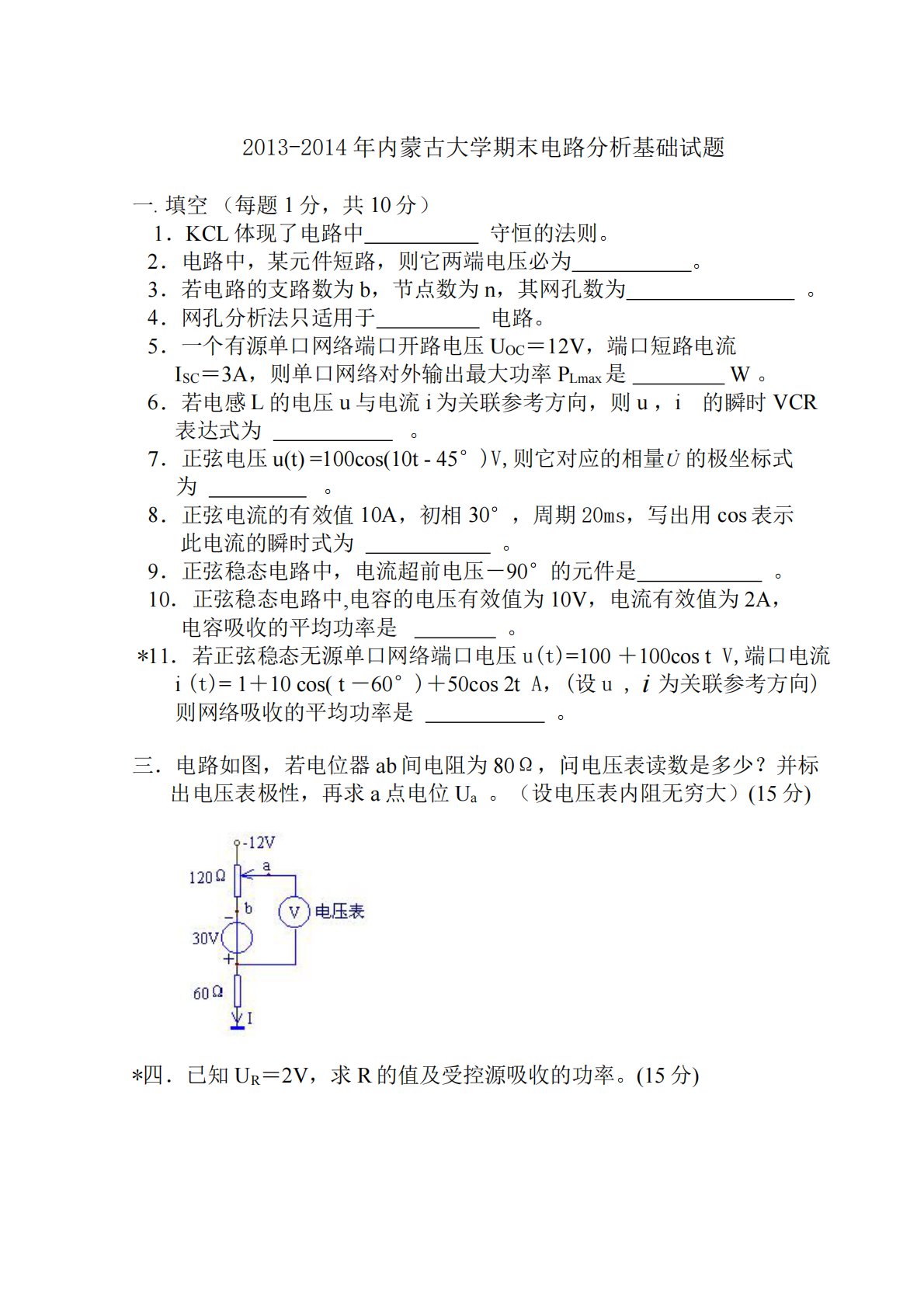 2013-2014年内蒙古大学期末电路分析基础试题一.填空(每题1分,共10分)1.KCL体现了电路中守恒的法则。2.电路中,某元件短路,则它两端电压必为。3.若电路的支路数为b,节点数为n,其网孔数为。4.网孔分析法只适用于电路。5.一个有源单口网络端口开路电压UOC=12V,端口短路电流ISC=3A,则单口网络对外输出最大功率PLmax是W。6.若电感L的电压u与电流i为关联参考方向,则u,i的瞬时VCR表达式为。7.正弦电压u(t)=100cos(10t-45°)V,则它对应的相量U的极坐标式为。8.正弦电流的有效值10A,初相30°,周期20ms,写出用cos表示此电流的瞬时式为。9...
