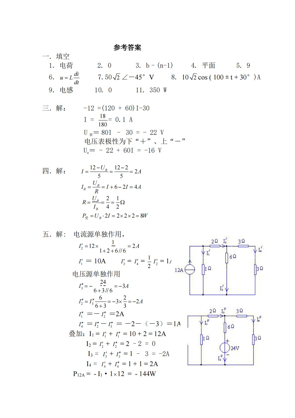di6.uLdt2∠-45°V8.102cos(100πt+30°)A9.电感7.5010.011.350W三.解:-12=(120+60)I-30I=18180=0.1AU表=80I–30=-22V电压表极性为下“+”、上“-”Ua=-22+60I=-16V四.解:1255122IUR2AURIRRI62I4A21IR42RURP受UR2I2228W五.解:电流源单独作用,I2121216//62AI3=I4=12I2=1AI1=10A电压源单独作用I36234//63A62I2I363332A...