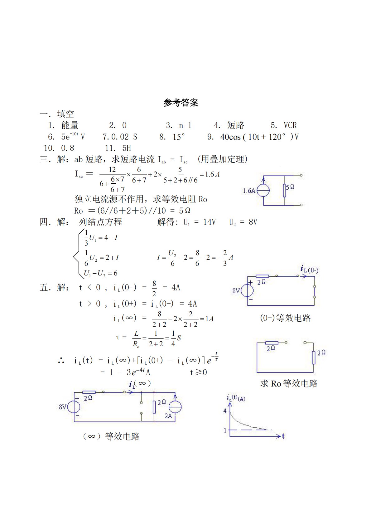 参考答案一.填空4.短路5.VCR1.能量6.5e-10tV3.n-18.15°9.40cos(10t+120°)V10.0.82.07.0.02S11.5H三.解:ab短路,求短路电流Iab=Isc(用叠加定理)Isc=126666776725256//61.6A独立电流源不作用,求等效电阻RoRo=(6//6+2+5)//10=5Ω四.解:列结点方程解得:U1=14VU2=8V113U14I6U22IU1U26826UI22623A五.解:t<0,iL(0-)=82=4At>0,iL(0+)=iL(0-)=4A82iL(∞)=22222...