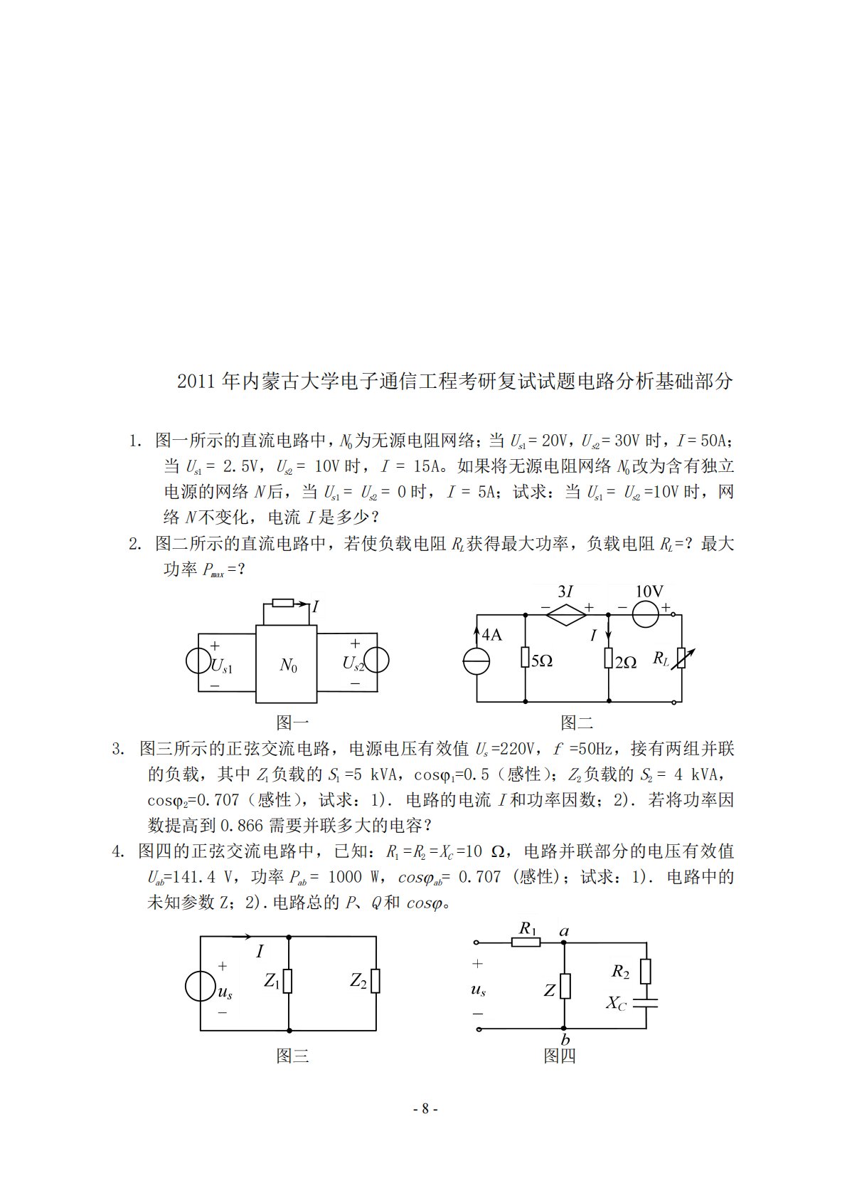 -8-2011年内蒙古大学电子通信工程考研复试试题电路分析基础部分1.图一所示的直流电路中,N0为无源电阻网络;当Us1=20V,Us2=30V时,I=50A;当Us1=2.5V,Us2=10V时,I=15A。如果将无源电阻网络N0改为含有独立电源的网络N后,当Us1=Us2=0时,I=5A;试求:当Us1=Us2=10V时,网络N不变化,电流I是多少?2.图二所示的直流电路中,若使负载电阻RL获得最大功率,负载电阻RL=?最大功率Pmax=?图一图二3.图三所示的正弦交流电路,电源电压有效值Us=220V,f=50Hz,接有两组并联的负载,其中Z1负载的S1=5kVA,cos1=0.5(感...