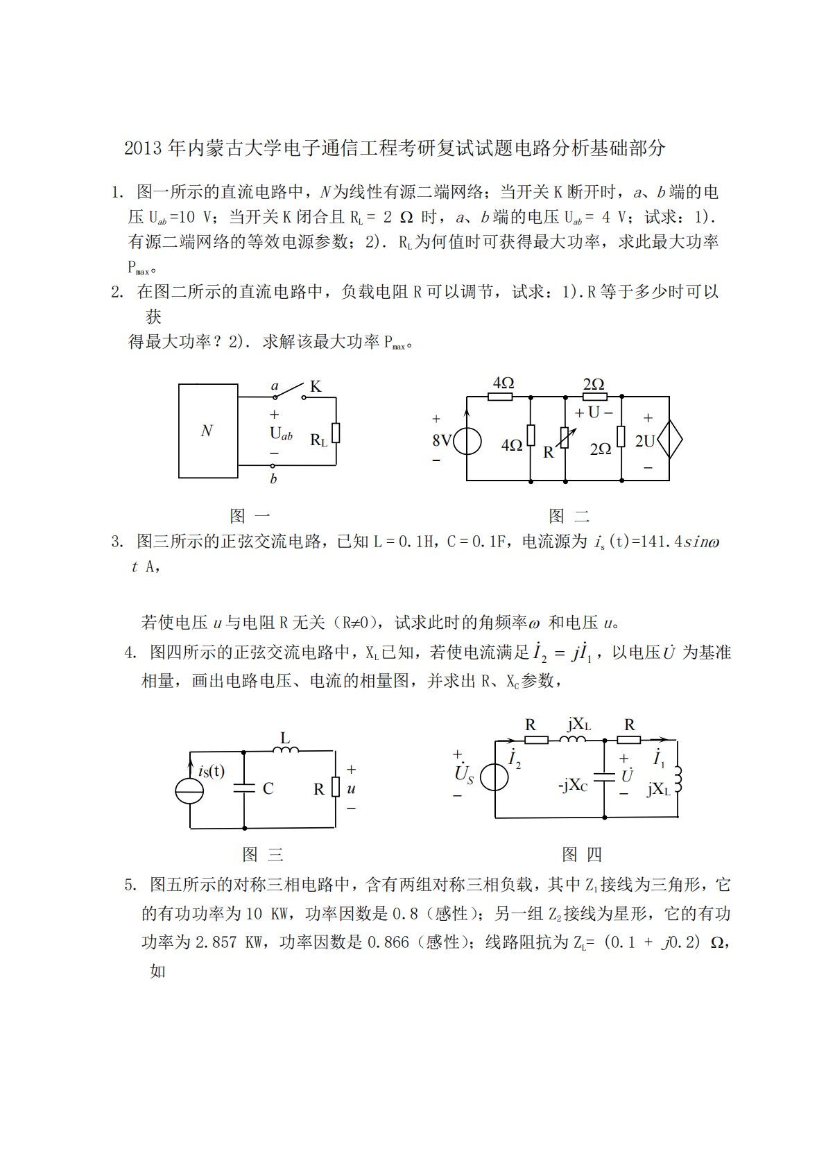 2013年内蒙古大学电子通信工程考研复试试题电路分析基础部分相量,画出电路电压、电流的相量图,并求出R、XC若使电压u与电阻R无关(R0),试求此时的角频率和电压u。4.图四所示的正弦交流电路中,XL已知,若使电流满足I2jI1,以电压U为基准参数,uiS(t)CLRI1I2jXLUSU-jXCjXLRR1.图一所示的直流电路中,N为线性有源二端网络;当开关K断开时,a、b端的电压Uab=10V;当开关K闭合且RL=2时,a、b端的电压Uab=4V;试求:1).有源二端网络的等效电源参数;2).RL为何值时可获得最大功率,求此最大功率Pmax。2.在图二所示的...