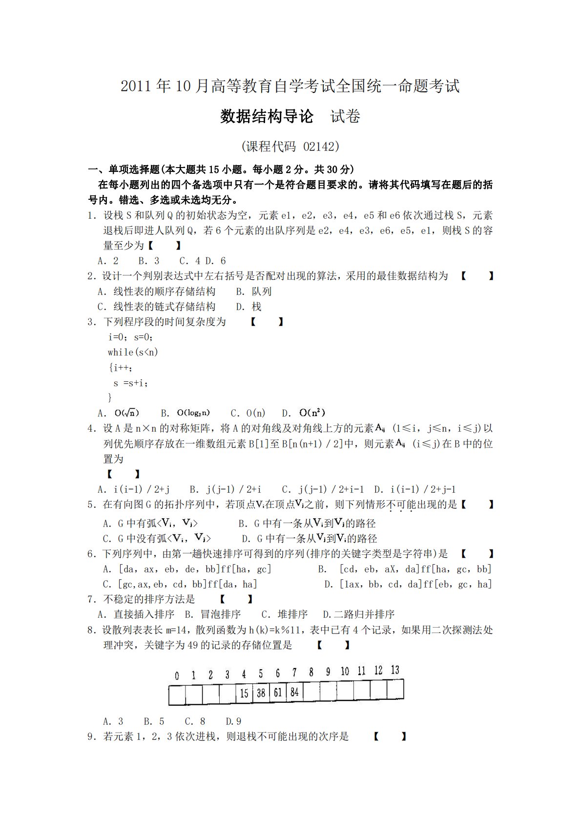 2011年10月高等教育自学考试全国统一命题考试数据结构导论试卷(课程代码02142)一、单项选择题(本大题共15小题。每小题2分。共30分)在每小题列出的四个备选项中只有一个是符合题目要求的。请将其代码填写在题后的括号内。错选、多选或未选均无分。1.设栈S和队列Q的初始状态为空,元素e1,e2,e3,e4,e5和e6依次通过栈S,元素退栈后即进人队列Q,若6个元素的出队序列是e2,e4,e3,e6,e5,e1,则栈S的容量至少为【】A.2B.3C.4D.62.设计一个判别表达式中左右括号是否配对出现的算法,采用的最佳数据结构为【】A.线性表的顺序存储结构B.队列C.线性表的链式存储结构D.栈...