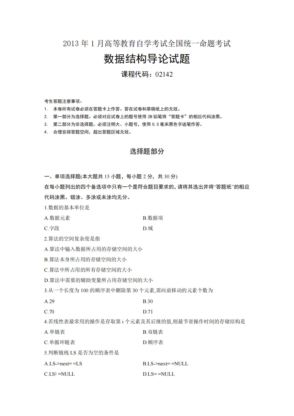 2013年1月高等教育自学考试全国统一命题考试数据结构导论试题课程代码:02142考生答题注意事项:1.本卷所有试卷必须在答题卡上作答。答在试卷和草稿纸上的无效。2.第一部分为选择题。必须对应试卷上的题号使用2B铅笔将“答题卡”的相应代码涂黑。3.第二部分为非选择题。必须注明大、小题号,使用0.5毫米黑色字迹笔作答。4.合理安排答题空间,超出答题区域无效。选择题部分一、单项选择题(本大题共15小题,每小题2分,共30分)在每小题列出的四个备选项中只有一个是符合题目要求的,请将其选出并将“答题纸”的相应代码涂黑。错涂、多涂或未涂均无分。1.数据的基本单位是A.数据元素B.数据项C.字段D.域2....