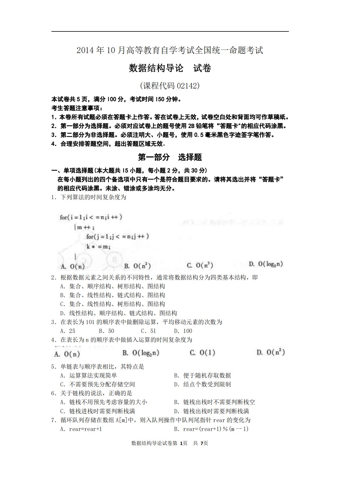 数据结构导论试卷第1页共7页2014年10月高等教育自学考试全国统一命题考试数据结构导论试卷(课程代码02142)本试卷共5页,满分l00分,考试时间l50分钟。考生答题注意事项:1.本卷所有试题必须在答题卡上作答。答在试卷上无效,试卷空白处和背面均可作草稿纸。2.第一部分为选择题。必须对应试卷上的题号使用2B铅笔将“答题卡"的相应代码涂黑。3.第二部分为非选择题。必须注明大、小题号,使用0.5毫米黑色字迹签字笔作答。4.合理安排答题空间,超出答题区域无效。第一部分选择题一、单项选择题(本大题共l5小题,每小题2分,共30分)在每小题列出的四个备选项中只有一个是符合题目要求的。请将其选出并将“...
