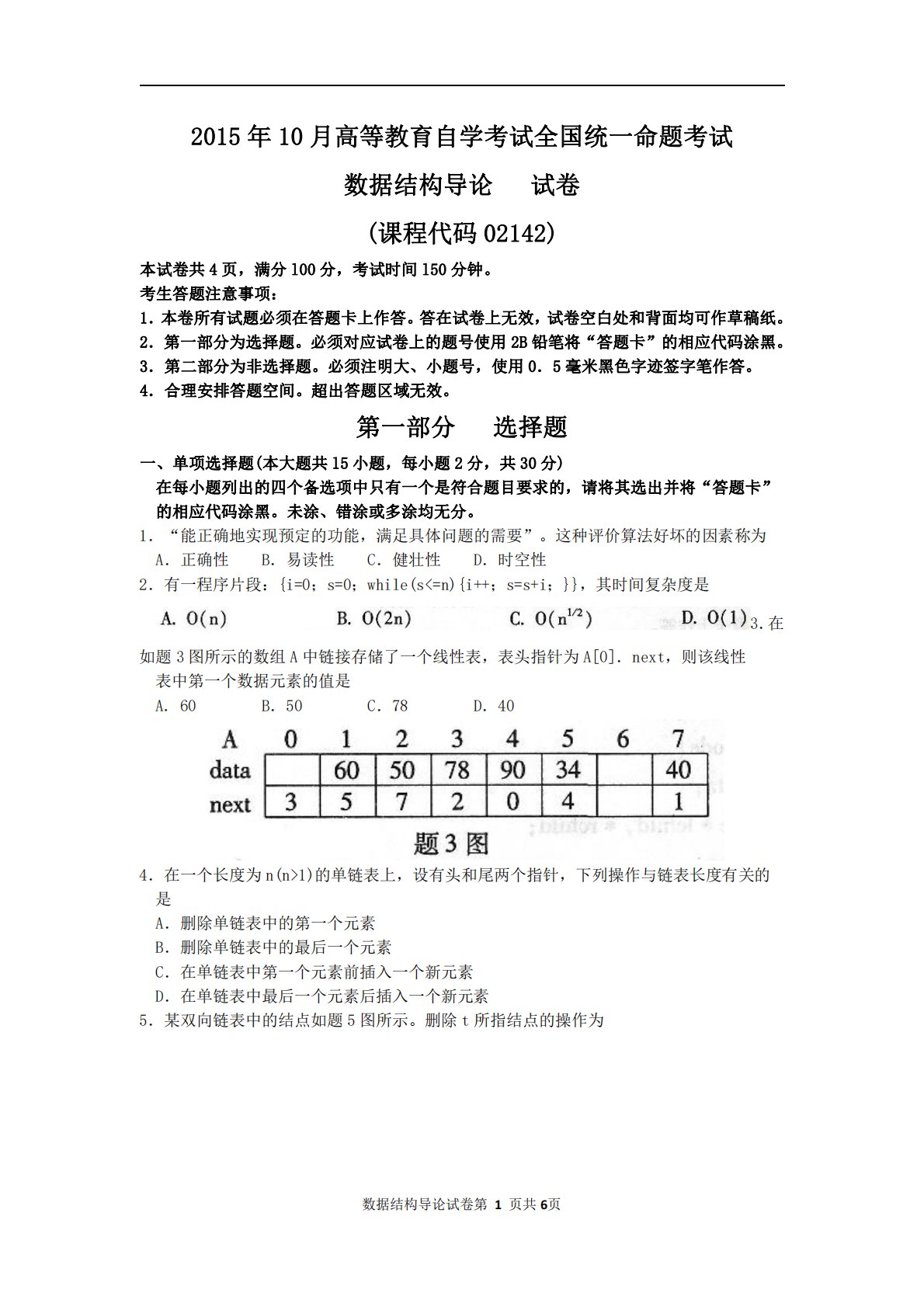 数据结构导论试卷第1页共6页2015年10月高等教育自学考试全国统一命题考试数据结构导论试卷(课程代码02142)本试卷共4页,满分l00分,考试时间l50分钟。考生答题注意事项:1.本卷所有试题必须在答题卡上作答。答在试卷上无效,试卷空白处和背面均可作草稿纸。2.第一部分为选择题。必须对应试卷上的题号使用2B铅笔将“答题卡”的相应代码涂黑。3.第二部分为非选择题。必须注明大、小题号,使用0.5毫米黑色字迹签字笔作答。4.合理安排答题空间。超出答题区域无效。第一部分选择题一、单项选择题(本大题共l5小题,每小题2分,共30分)在每小题列出的四个备选项中只有一个是符合题目要求的,请将其选出并将“...