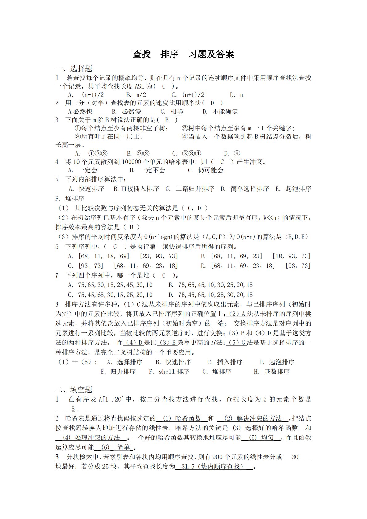 查找排序习题及答案一、选择题1若查找每个记录的概率均等,则在具有n个记录的连续顺序文件中采用顺序查找法查找一个记录,其平均查找长度ASL为(C)。A.(n-1)/2B.n/2C.(n+1)/2D.n2用二分(对半)查找表的元素的速度比用顺序法(D)A必然快B.必然慢C.相等D.不能确定3下面关于m阶B树说法正确的是(B)①每个结点至少有两棵非空子树;②树中每个结点至多有m一1个关键字;③所有叶子在同一层上;④当插入一个数据项引起B树结点分裂后,树长高一层。A.①②③B.②③C.②③④D.③4将10个元素散列到100000个单元的哈希表中,则(C)产生冲突。A.一定会B.一定不会C.仍可能会5下...