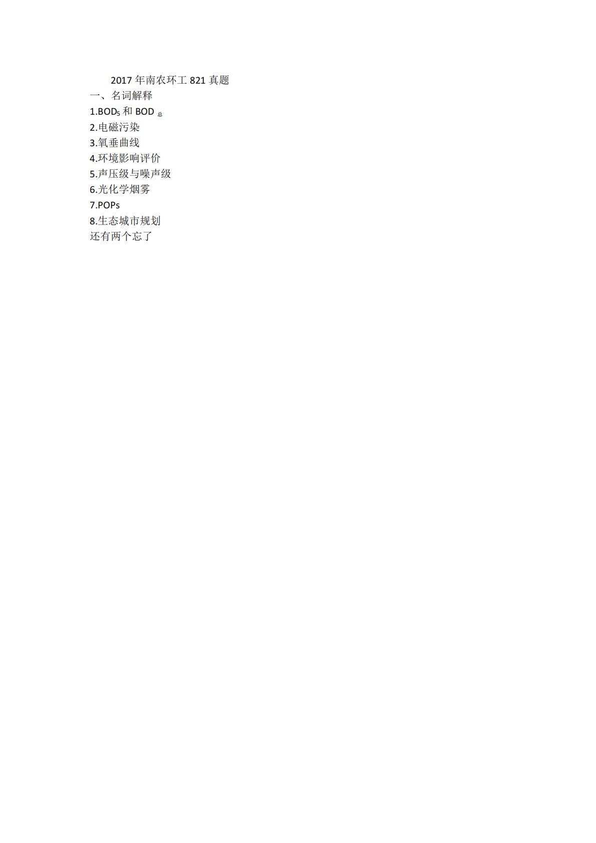2017年南农环工821真题一、名词解释1.BOD5和BOD总2.电磁污染3.氧垂曲线4.环境影响评价5.声压级与噪声级6.光化学烟雾7.POPs8.生态城市规划还有两个忘了2017年南农环工821真题一、名词解释1.BOD5和BOD总2.电磁污染3.氧垂曲线4.环境影响评价5.声压级与噪声级6.光化学烟雾7.POPs8.生态城市规划还有两个忘了二、简答题1.重金属对土壤环境有什么影响,请举例说明土壤重金属污染的危害2.什么是危险废物?与固体废物相比,危险废物处置过程中有哪些特别的规定3.活性污泥,影响活性污泥处理效果的因素,及处理生活污水的工艺4.噪声污染有何特性?其主要控制技术?5.影响大...