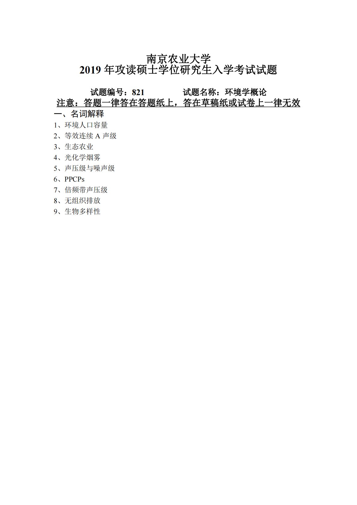 南京农业大学2019年攻读硕士学位研究生入学考试试题试题编号:821试题名称:环境学概论注意:答题一律答在答题纸上,答在草稿纸或试卷上一律无效一、名词解释1、环境人口容量2、等效连续A声级3、生态农业4、光化学烟雾5、声压级与噪声级6、PPCPs7、倍频带声压级8、无组织排放9、生物多样性南京农业大学2019年攻读硕士学位研究生入学考试试题试题编号:821试题名称:环境学概论注意:答题一律答在答题纸上,答在草稿纸或试卷上一律无效一、名词解释1、环境人口容量2、等效连续A声级3、生态农业4、光化学烟雾5、声压级与噪声级6、PPCPs7、倍频带声压级8、无组织排放9、生物多样性10、MLSS11、...