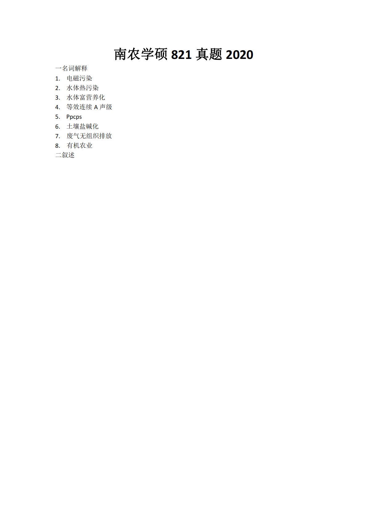 南农学硕821真题2020一名词解释1.电磁污染2.水体热污染3.水体富营养化4.等效连续A声级5.Ppcps6.土壤盐碱化7.废气无组织排放8.有机农业二叙述南农学硕821真题2020一名词解释1.电磁污染2.水体热污染3.水体富营养化4.等效连续A声级5.Ppcps6.土壤盐碱化7.废气无组织排放8.有机农业二叙述1.大气的环境容量?光化学烟雾?2.我国的水体有几类水,分别的适用范围?3.说出三种大气污染物,并说明其危害4.怎样理解环境问题,列举两个中国紧迫的环境问题5.从财产占有权方面,论述可再生资源的划分及可再生资源的保护措施6.土壤如何避免物理性污染?三简答1.畜禽养殖废水主要污染物...
